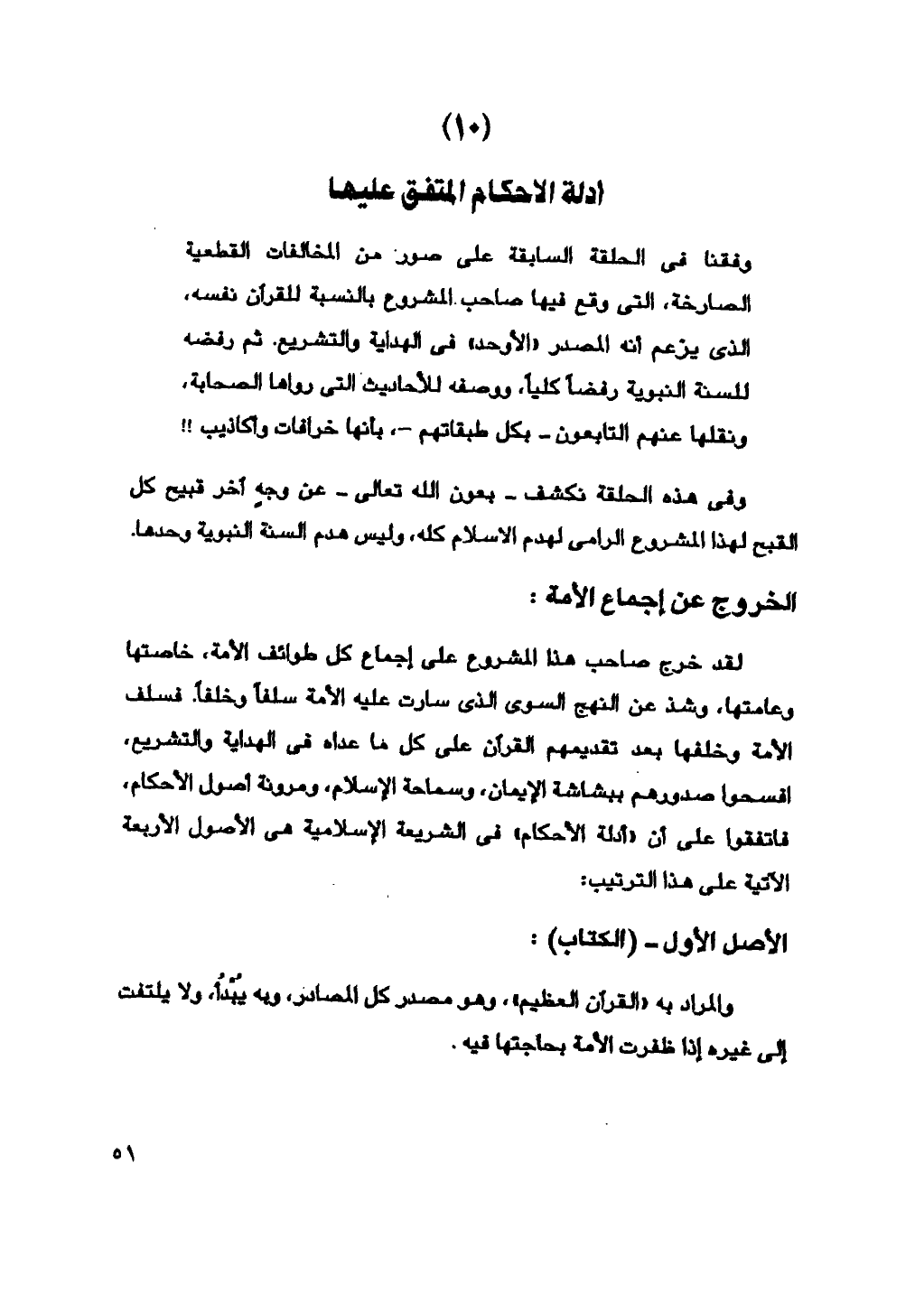 لقد خرج هذا المشروع على إجماع كل طوائف الأمة، خاتصتها وعامتها، وش عن النهج السوي الذي سارت عليه الأمة سلفاً وخلفاً. فسلف الأمة وخلفها بعد تقديمهم القرآن على كل ما عداه في الهداية والتشريع، أفسحوا صدورهم ببشاشة الإيمان، وسماحة الإسلام، ومرونة أصول الأحكام، فاتفقوا على أن "أدلة الأحكام" في الشريعة الإسلامية هي الأصول الأربعة على هذا الترتيب: