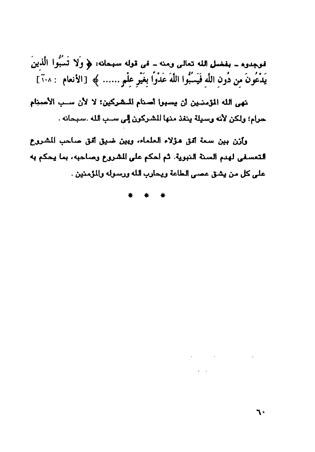 نهى الله المؤمنين أن يسبوا أصنام المشركين: لا لأن سب الأصنام حرام؛ ولكن لأنه وسيلة ينقذ منها المشركون إلى سب الله سبحانه.