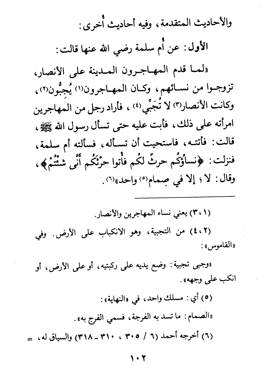 "لما قدم المهاجرون المدينة على الأنصار تزوجوا من نسائهم وكان المهاجرون1 يجبون2 وكانت الأنصار3 لا تجبي4 فأراد رجل من المهاجرين امرأته على ذلك فأبت عليه حتى تسأل رسول الله صلى الله عليه وسلم قالت: فأتته فاستحيت أن تسأله فسألته أم سلمة فنزلت: {نِسَاؤُكُمْ حَرْثٌ لَكُمْ فَأْتُوا حَرْثَكُمْ أَنَّى شِئْتُمْ} وقال: "لا إلا في صمام 5 واحد" 6.