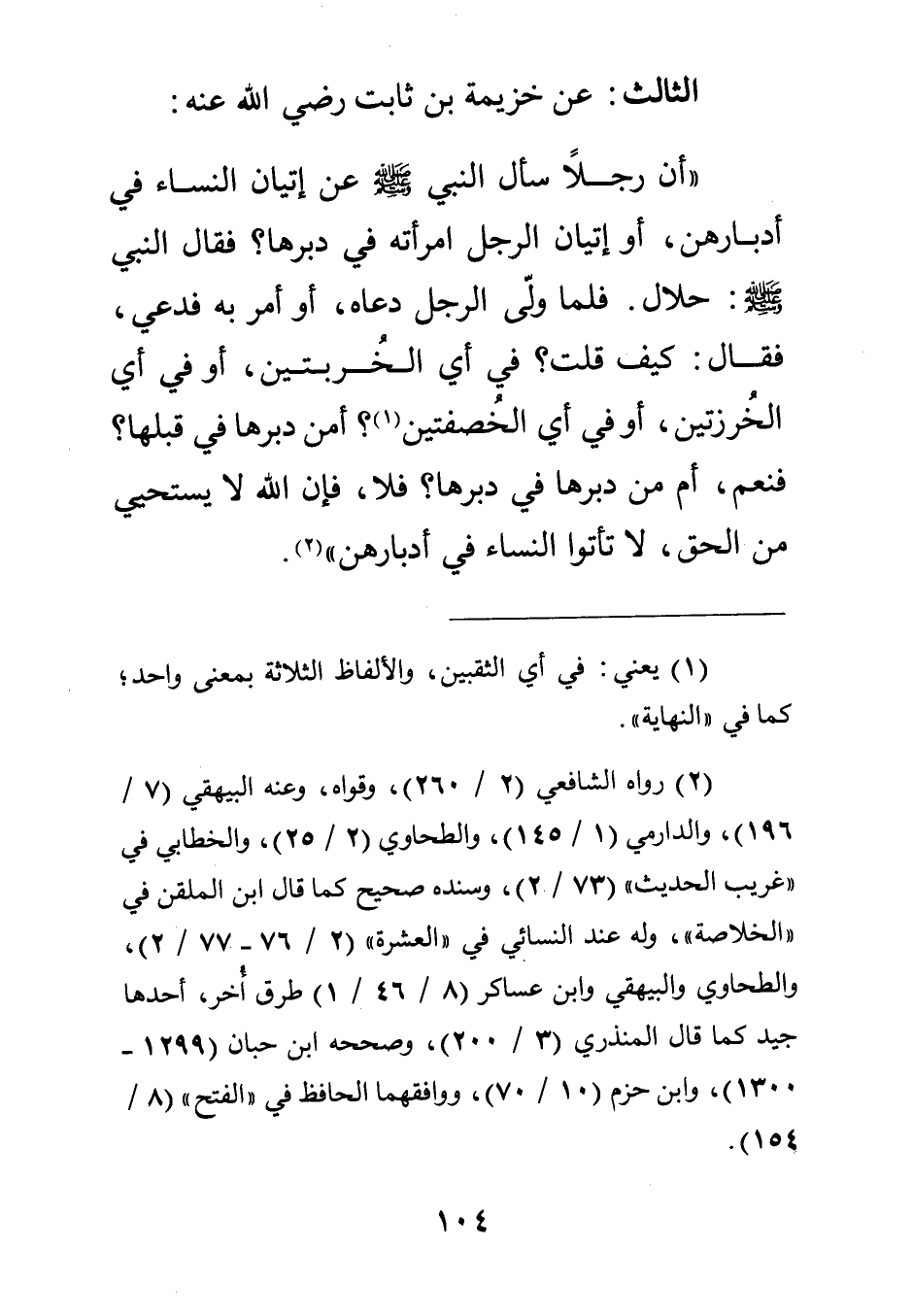 "أن رجلا سأل النبي صلى الله عليه وسلم عن إتيان النساء في أدبارهن أو إتيان الرجل امرأته في دبرها؟ فقال النبي صلى الله عليه وسلم: "حلال". فلما ولى الرجل دعاه أو أمر به فدعي فقال: "كيف قلت؟ في أي الخربتين أوفي الخرزتين أو في أي الخصفتين1؟ أمن دبرها في قبلها؟ فنعم أم من دبرها في دبرها؟ فلا فإن الله لا يستحي من الحق لا تأتوا النساء في أدبارهن" 2.