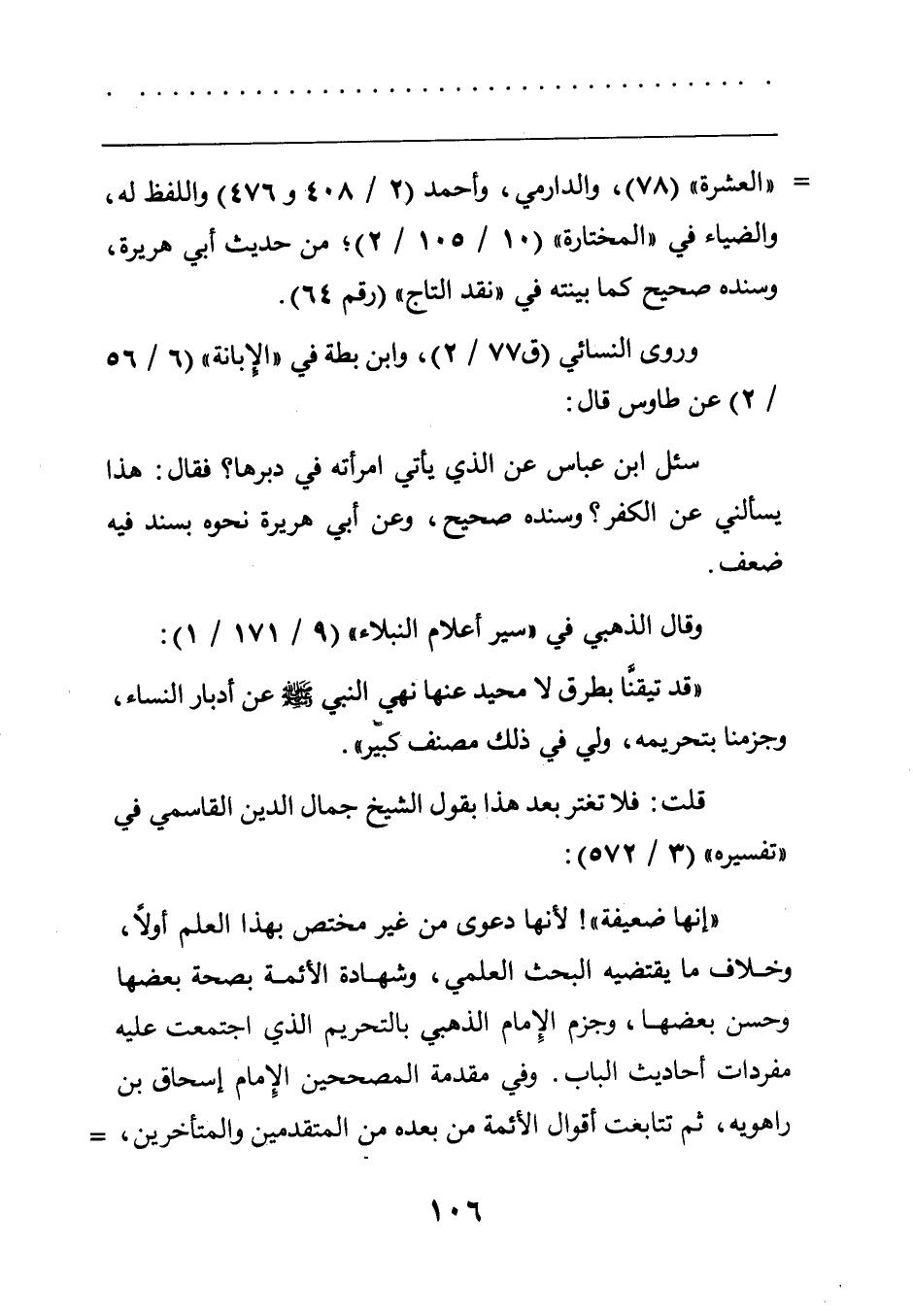 "إنها ضعيفة"! لأنها دعوى من غير مختص بهذا العلم أولا وخلاف ما يقتضيه البحث العلمي وشهادة الأئمة بصحة بعضها وحسن بعضها وجم الإمام الذهبي بالتحريم الذي اجتمعت عليه مفردات أحاديث الباب. وفي مقدمة المصححين الإمام إسحاق بن راهويه ثم تتابعت أقوال الأئمة من بعده من المتقدمين والمتأخرين=