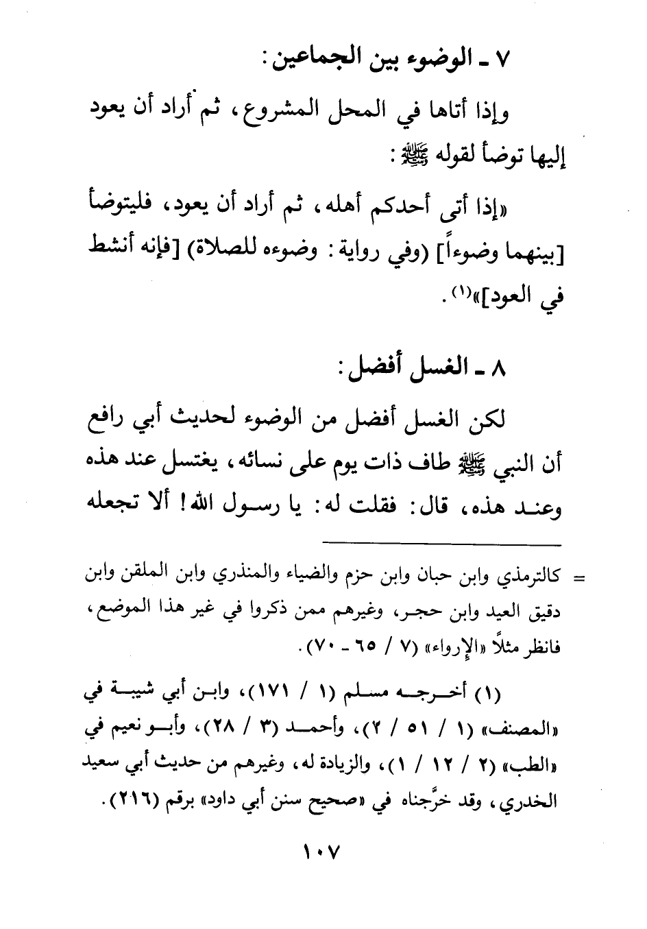 لكن الغسل أفضل من الوضوء لحديث أبي رافع أن النبي صلى الله عليه وسلم طاف ذات يوم على نسائه يغتسل عند هذه وعند هذه قال: فقلت له: يا رسول الله! ألا تجعله