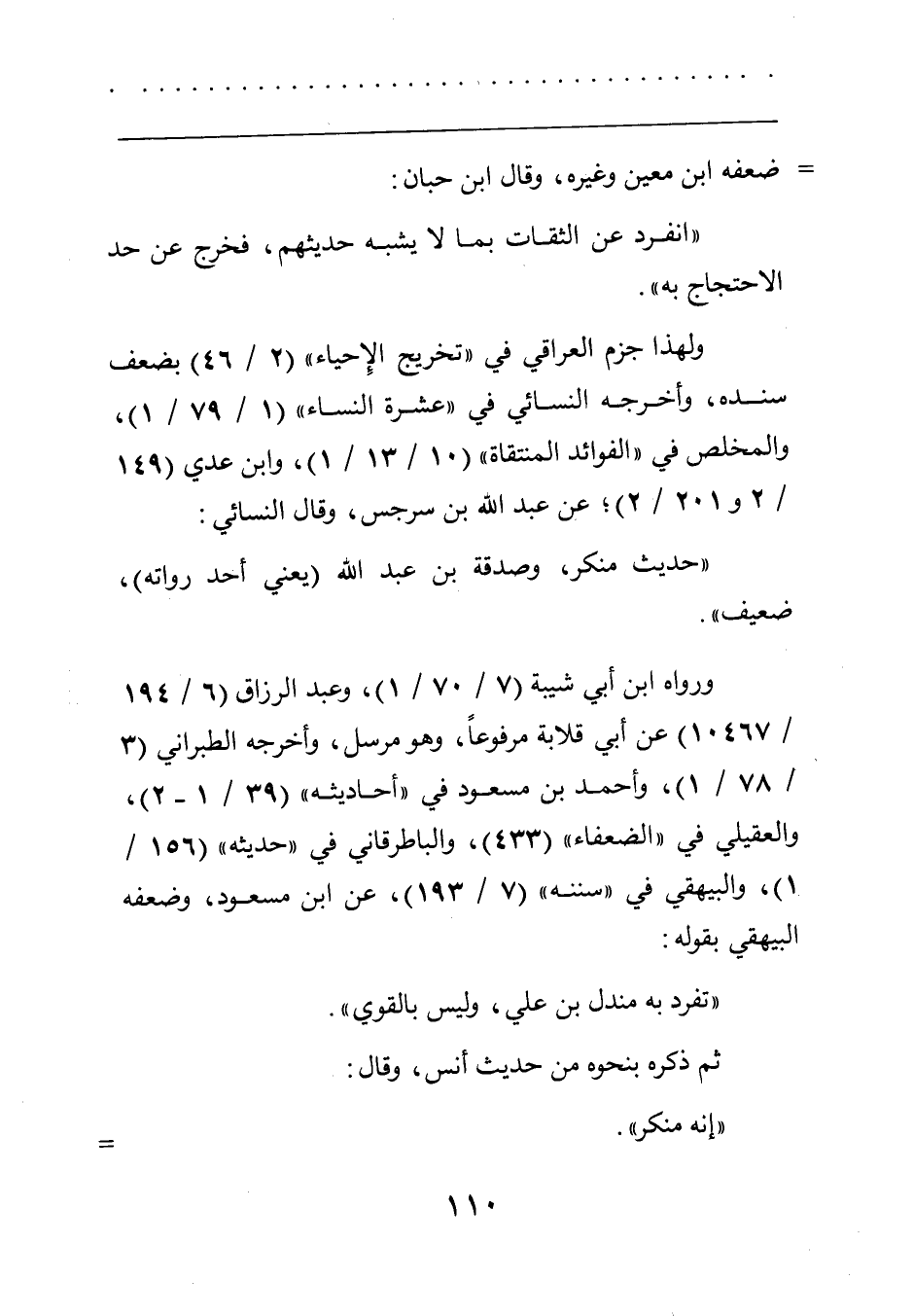 ورواه ابن أبي شيبة 7/70/1 وعبد الرزاق 6/194/10467 عن أبي قلابة مرفوعا وهو مرسل وأخرجه الطبراني 3/178/1 وأحمد ابن مسعود في أحاديثه 39/1 – 2 والعقيلي في الضعفاء 433 والباطرقاني في حديثه 156/1 والبيهقي في سننه 7/193 عن ابن مسعود وضعفه البيهقي بقوله:
