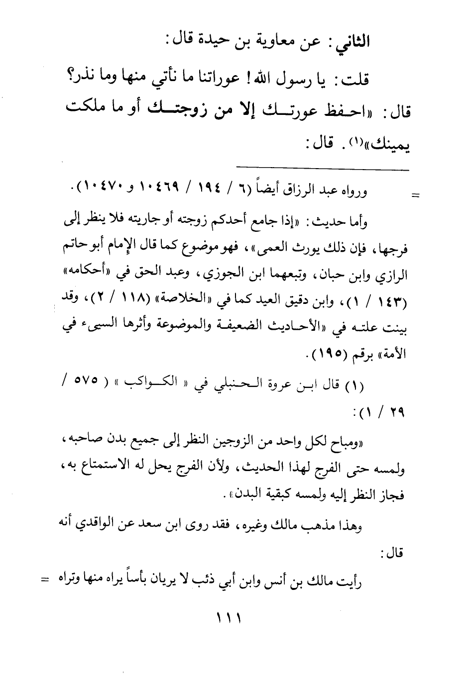 قلت: يا رسول الله! عوراتنا ما نأتي منها وما نذر؟ قال: "احفظ عورتك إلا من زوجتك أو ما ملكت يمينك" 1. قال: