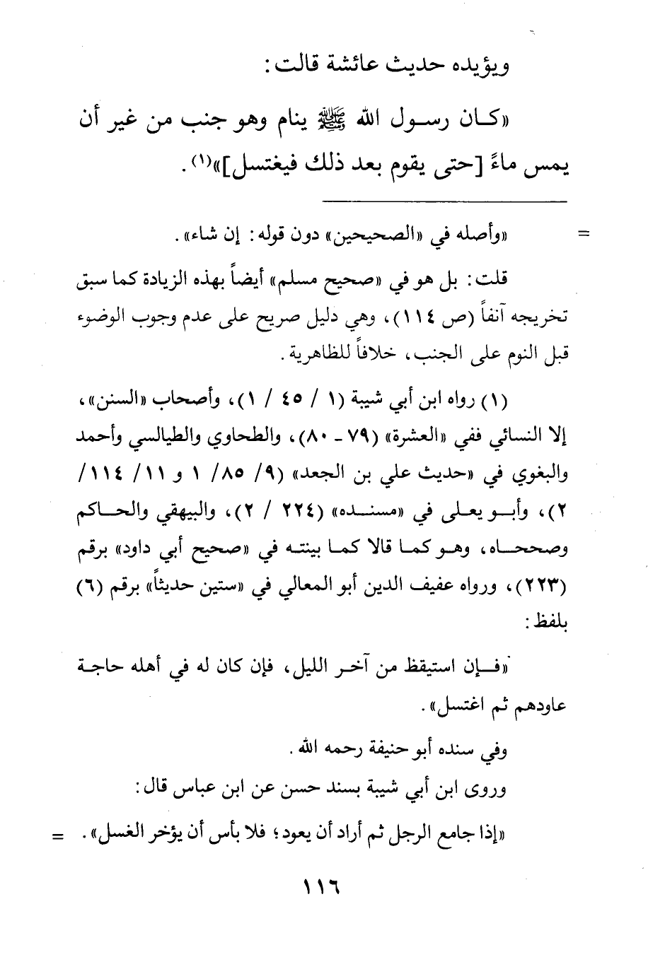 قلت: بل هو في " صحيح مسلم " أيضا بهذه الزيادة كما سبق تخريجه آنفا ص 114 وهي دليل صريح على عدم وجوب الوضوء قبل النوم على الجنب خلافا للظاهرية.