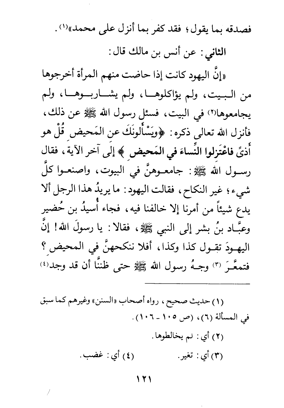 "إن اليهود كانت إذا حاضت منهم المرأة أخرجوها من البيت ولم يؤاكلوها ولم يشاربوها ولم يجامعوها2 في البيت فسئل رسول الله صلى الله عليه وسلم عن ذلك فأنزل الله تعالى ذكره {وَيَسْأَلونَكَ عَنِ الْمَحِيضِ قُلْ هُوَ أَذىً فَاعْتَزِلُوا النِّسَاءَ فِي الْمَحِيضِ} إلى آخر الآية فقال رسول الله صلى الله عليه وسلم: "جامعوهن في البيوت واصنعوا كل شيء غير النكاح" فقالت اليهود: ما يريد هذا الرجل ألا يدع شيئا من أمرنا إلا خالفنا فيه فجاء أسيد بن حضير وعباد بن بشر إلى النبي صلى الله عليه وسلم فقالا يا رسول الله! إن اليهود تقول كذا وكذا أفلا ننكحهن في المحيض؟ فتمعر3 وجه رسول الله صلى الله عليه وسلم حتى ظننا أن قد وجد4