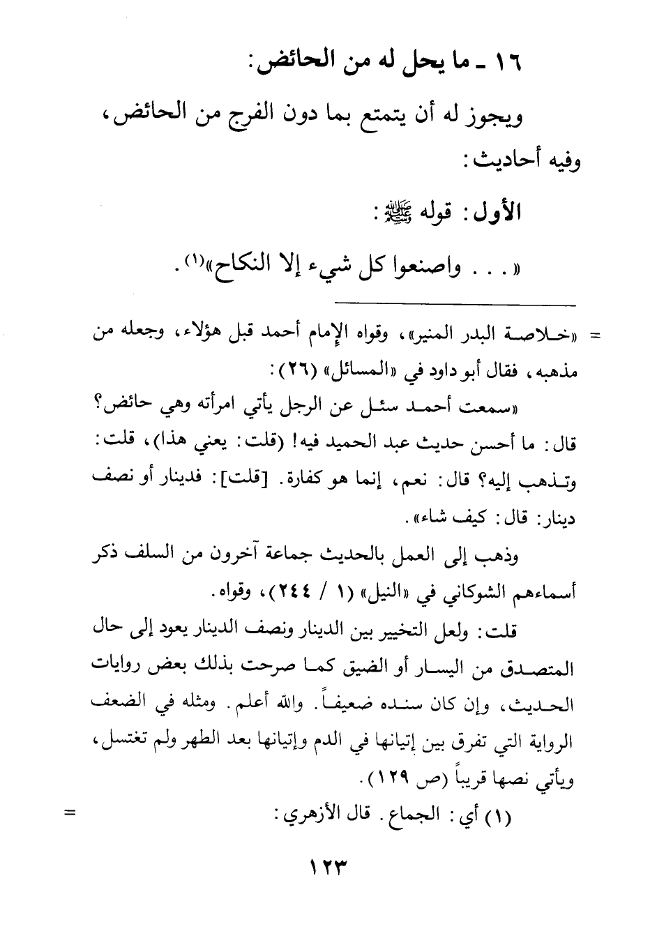 "سمعت أحمد سئل عن الرجل يأتي امرأته وهي حائض؟ قال: ما أحسن حديث عبد الحميد فيه! قلت: يعني هذا قلت: وتذهب إليه؟ قال: نعم إنما هو كفارة. [قلت] : فدينار أو نصف دينار: قال: كيف شاء"