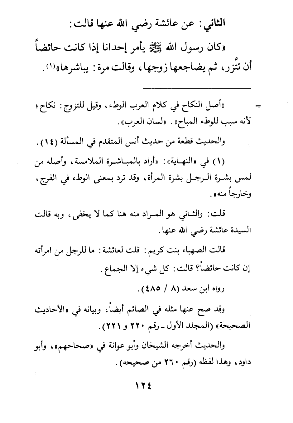 "كان رسول الله صلى الله عليه وسلم يأمر إحدانا إذا كانت حائضا أن تتزر ثم يضاجعها زوجها وقالت مرة: يباشرها"1.