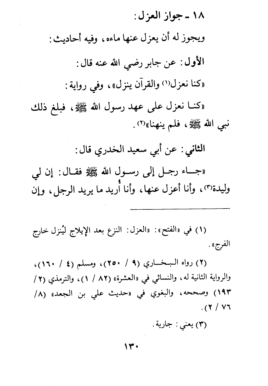 "كنا نعزل على عهد رسول الله صلى الله عليه وسلم فبلغ ذلك نبي الله صلى الله عليه وسلم فلم ينهنا"2.