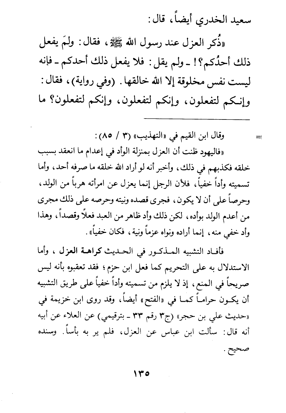 "ذكر العزل عند رسول الله صلى الله عليه وسلم فقال: "ولم يفعل ذلك أحدكم؟! " - ولم يقل: فلا يفعل ذلك أحدكم - "فإنه ليست نفس مخلوقة إلا الله خالقها". وفي رواية فقال: "وإنكم لتفعلون وإنكم لتفعلون وإنكم لتفعلون؟ ما