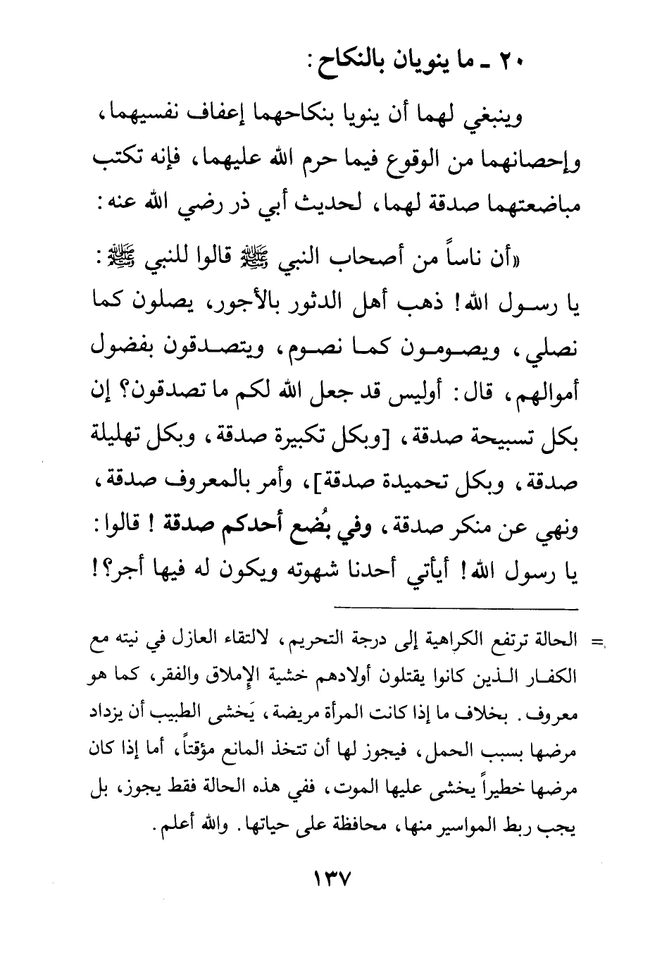 "أن ناسا من أصحاب النبي صلى الله عليه وسلم قالوا للنبي صلى الله عليه وسلم: يا رسول الله! ذهب أهل الدثور بالأجور يصلون كما نصلي ويصومون كما نصوم ويتصدقون بفضول أموالهم قال: "أو ليس قد جعل الله لكم ما تصدقون؟ إن بكل تسبيحة صدقة [وبكل تكبير صدقة وبكل تهليلة صدقة وبكل تحميدة صدقة] وأمر بالمعروف صدقة ونهي عن منكر صدقة وفي بضع أحدكم صدقة! " قالوا: يا رسول الله أيأتي أحدنا شهوته ويكون له فيها أجر؟!