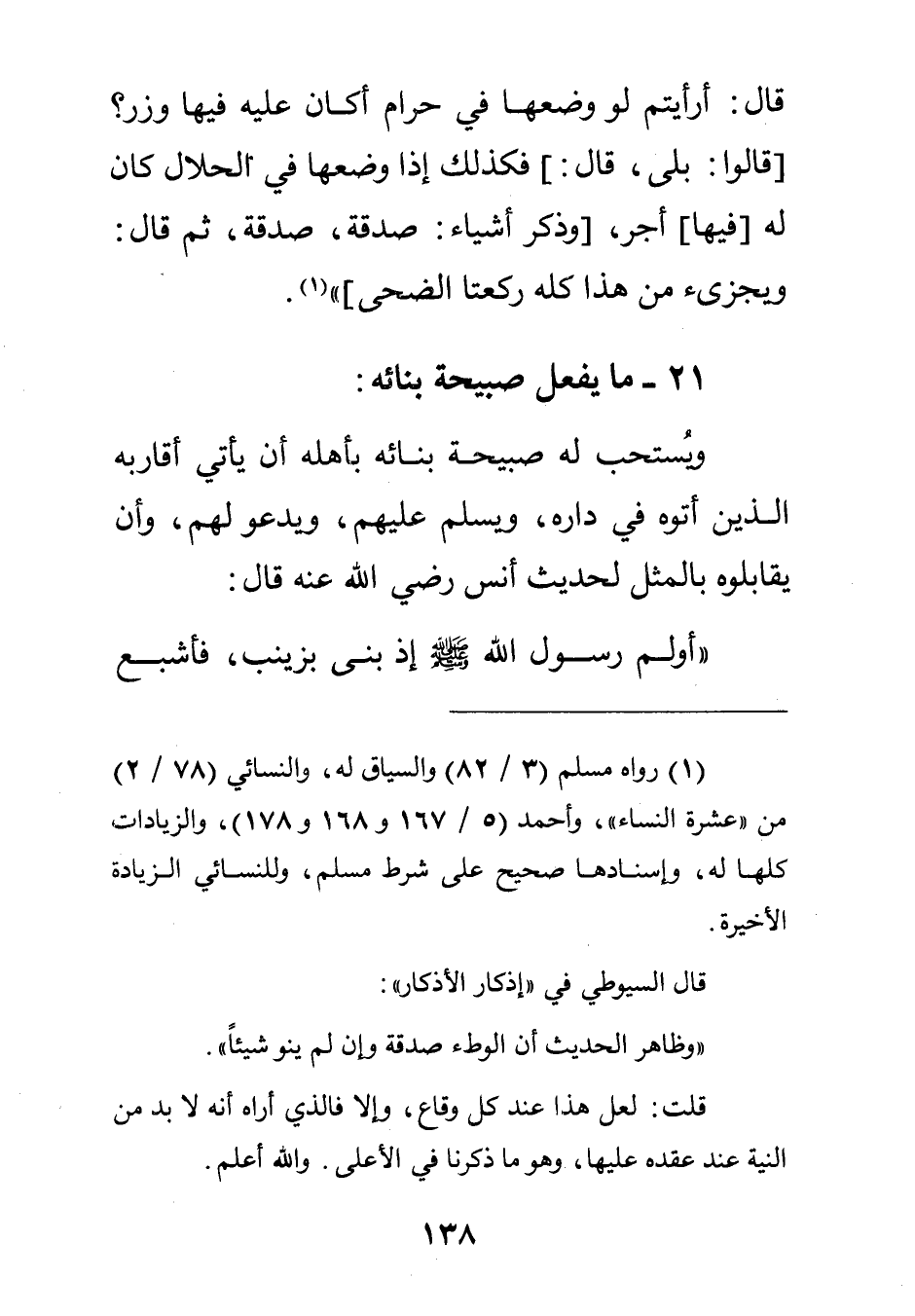 قال: "أرأيتم لو وضعها في حرام أكان عليها فيها وزر؟ " [قالوا: بلى قال:] "فكذلك إذا وضعها في الحلال كان له [فيها] أجر" [وذكر أشياء: صدقة صدقة ثم قال: "ويجزئ من هذا كله ركعتا الضحى"] " 1.