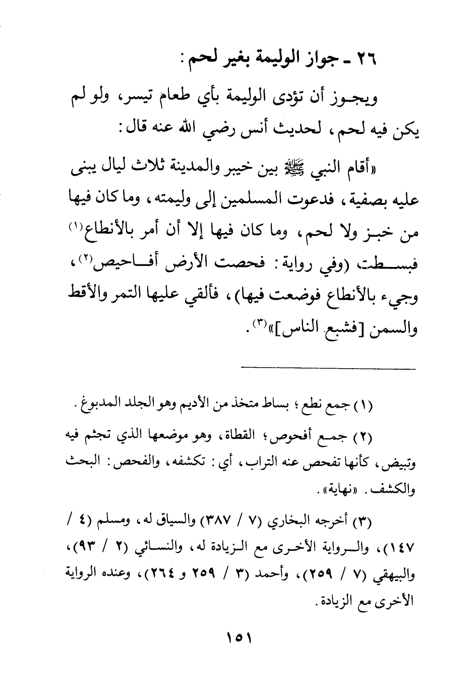 "أقام النبي صلى الله عليه وسلم بين خيبر والمدينة ثلاث ليال يبني عليه بصفية فدعوت المسلمين إلى وليمته وما كان فيها من خبز ولا لحم وما كان فيها إلا أن أمر بالأنطاع1 فبسطت وفي رواية: فحصت الأرض أفاحيص2 وجيء بالأنطاع فوضعت فيها فألقي عليها التمر والأقط والسمن [فشبع الناس] "3.
