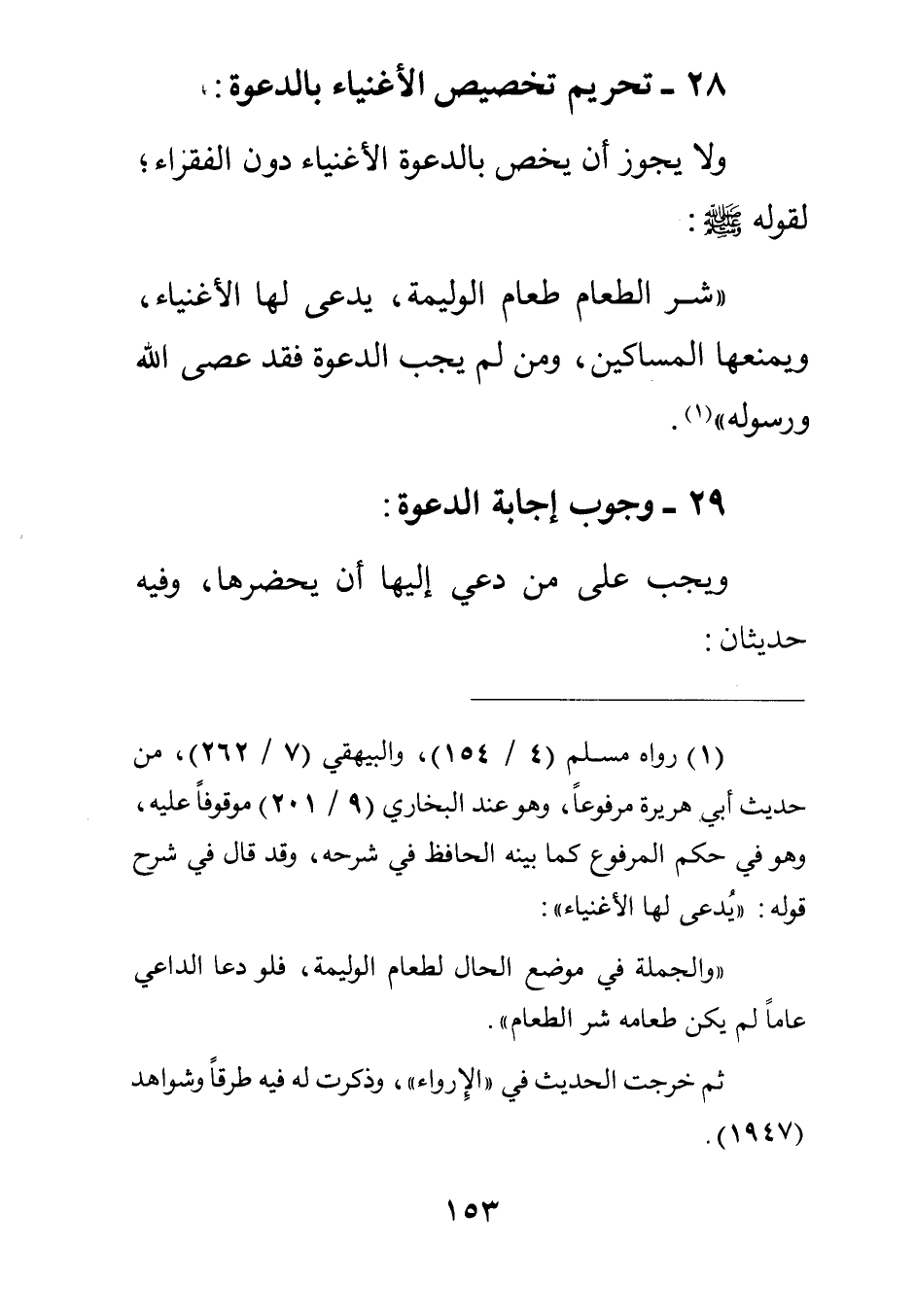 "شر الطعام طعام الوليمة يدعى لها الأغنياء ويمنعها المساكين ومن لم يجب الدعوة فقط عصى الله ورسوله" 1.