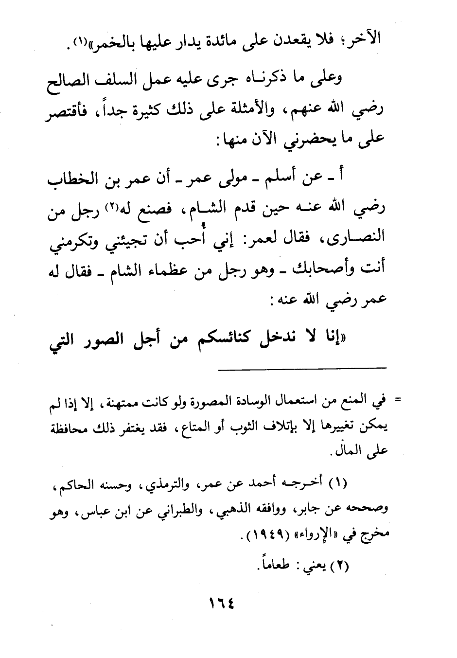 أ - عن أسلم - مولى عمر - أن عمر بن الخطاب رضي الله عنه حين قدم الشام فصنع له2 رجل من النصارى فقال لعمر: إني أحب أن تجيئني وتكرمني أنت وأصحابك - وهو رجل من عظماء الشام - فقال له عمر رضي الله عنه: