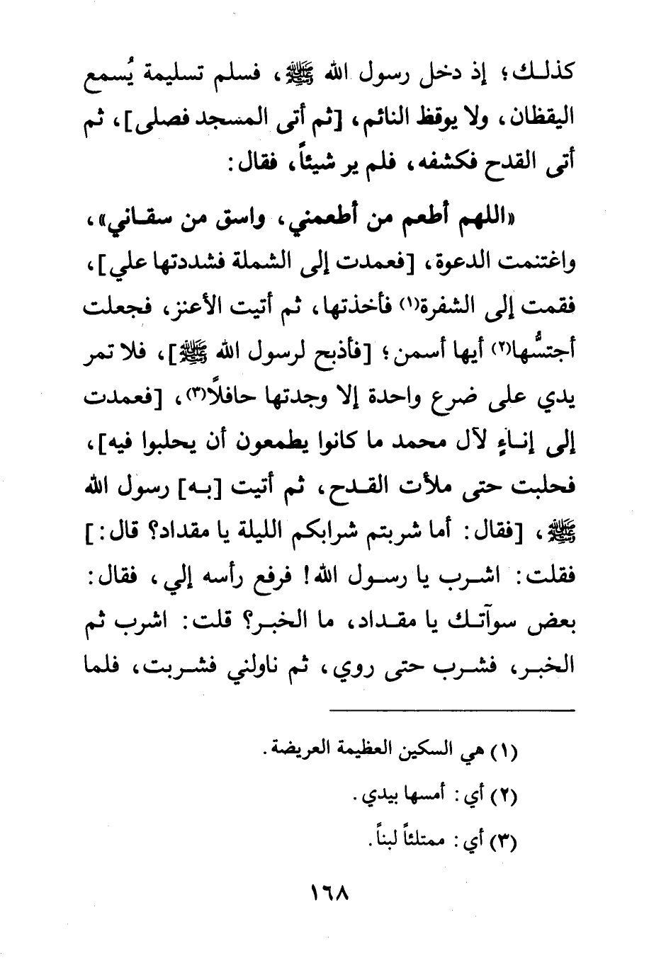 "اللهم أطعم من أطعمني واسق من سقاني" , واغتنمت الدعوة [فعمدت إلى الشملة فشددتها علي] فقمت إلى الشفرة1 1 فأخذتها ثم أتيت الأعنز فجعلت أجتسها2 أيها اسمن [فأذبح لرسول الله صلى الله عليه وسلم] فلا تمر يدي على ضرع واحدة إلا وجدتها حافلا3 [فعمدت إلى إناء لآل محمد ما كانوا يطمعون أن يحلبوا فيه] فحلبت حتى ملأت القدح ثم أتيت [به] رسول الله صلى الله عليه وسلم [فقال: "أما شربتم شرابكم الليلة يا مقداد؟ " قال:] فقلت: اشرب يا رسول الله! فرفع رأسه إلي فقال: "بعض سوآتك يا مقداد ما الخبر؟ " قلت: اشرب ثم الخبر فشرب حتى روي ثم ناولني فشربت فلما