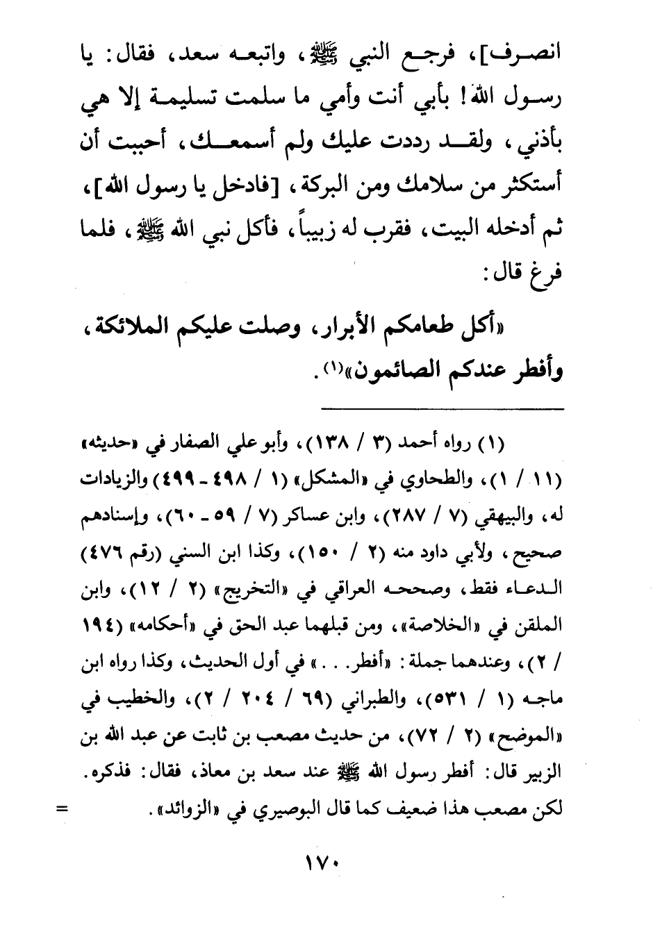 1 رواه أحمد 3/138 وأبو علي الصفار في حديثه والطحاوي في المشكل 1/498 – 499 والزيادات له والبيهقي 7/287 وابن عساكر 7/59 - 60 وإسنادهم صحيح ولأبي داود منه 2/150 وكذا ابن السني رقم 476 الدعاء فقط وصححه العراقي في التخريج 2/12 وابن الملقن في الخلاصة ومن قبلهما عبد الحق في أحكامه 194/2 وعندهما جملة: "أفطر ... " في أول الحديث وكذا رواه ابن ماجه 1/531 والطبراني 69/204/2 والخطيب في الموضح 2/72 من حديث مصعب بن ثابت عن عبد الله بن الزبير قال: أفطر رسول الله صلى الله عليه وسلم عند سعد بن معاذ فقال: فذكره.