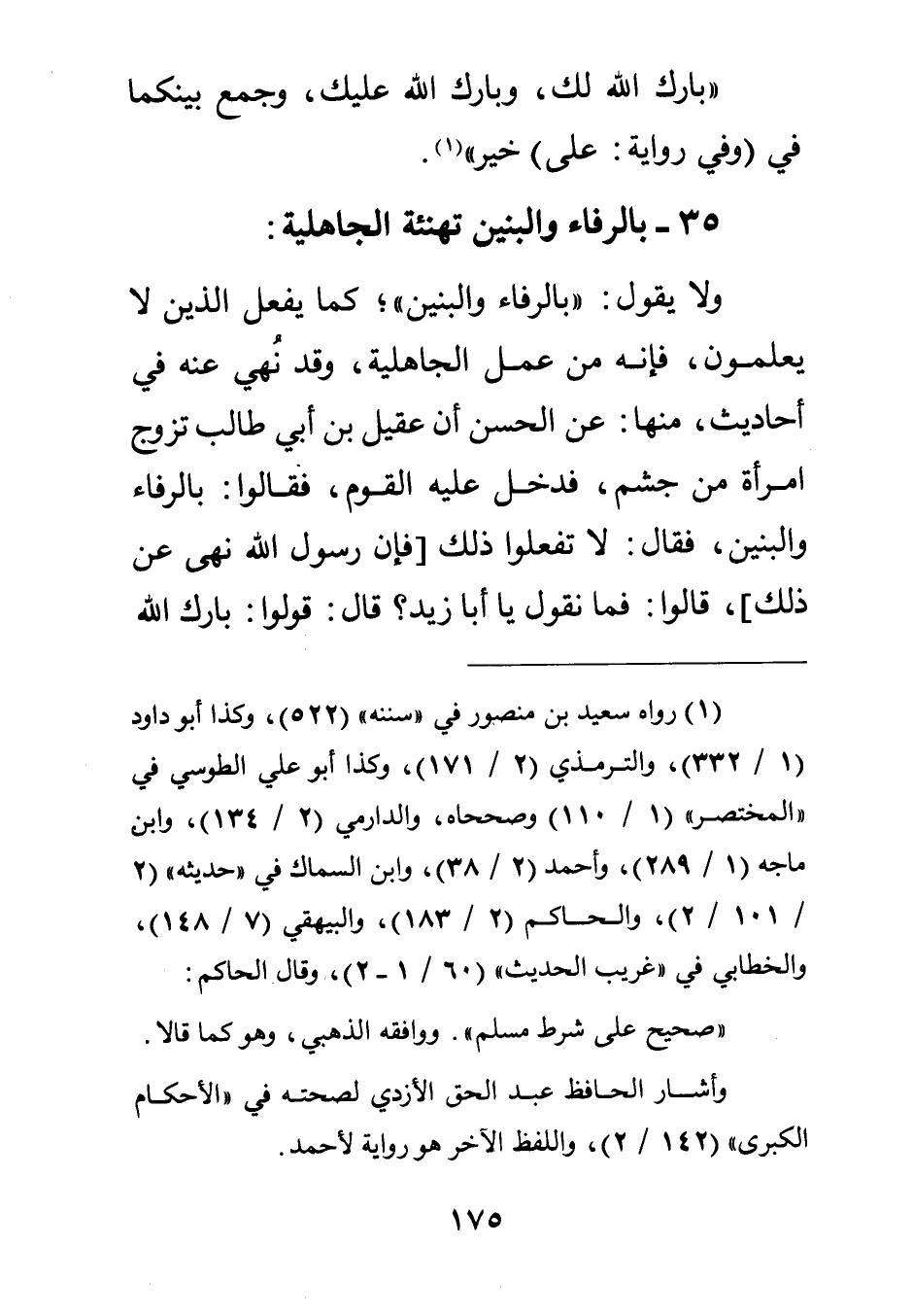 ولا يقول: "بالرفاء والبنين" كما يفعل الذين لا يعلمون فإنه من عمل الجاهلية وقد نهي عنه في أحاديث منها: عن الحسن أن عقيل بن أبي طالب تزوج امرأة من جشم فدخل عليه القوم فقالوا: بالرفاء والبنين فقال: لا تفعلوا ذلك [فإن رسول الله صلى الله عليه وسلم نهى عن ذلك] قالوا: فما نقول يا أبا زيد؟ قال: قولوا: بارك الله