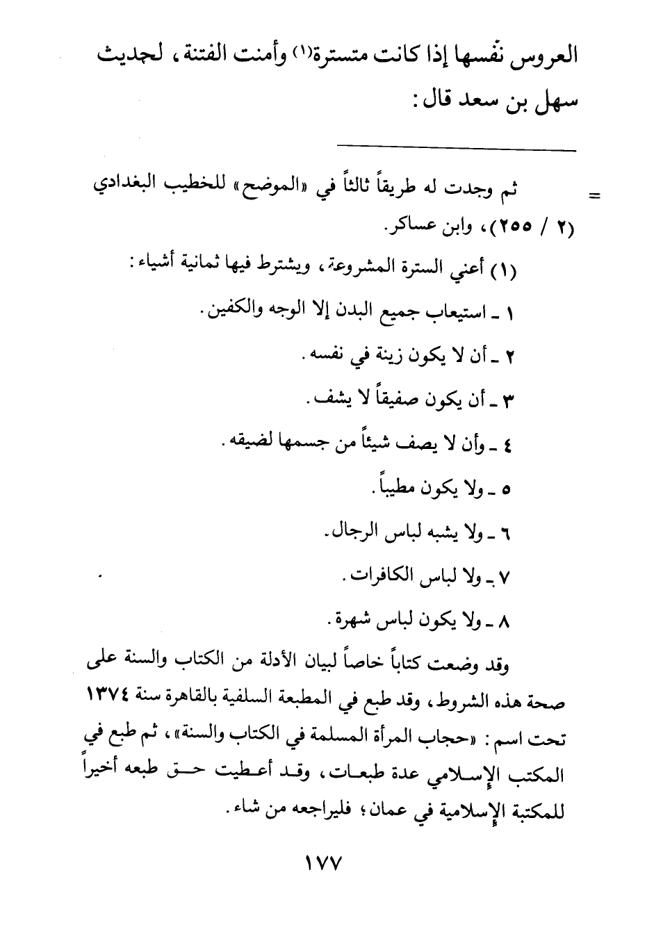 وقد وضعت كتابا خاصا لبيان الأدلة من الكتاب والسنة على صحة هذه الشروط وقد طبع في المطبعة السلفية بالقاهرة سنة 1374 تحت اسم: "حجاب المرأة المسلمة في الكتاب والسنة" ثم طبع في المكتب الإسلامي عدة طبعات وقد أعطيت حق طبعه أخيرا للمكتبة الإسلامية في عمان فليراجعه من شاء.
