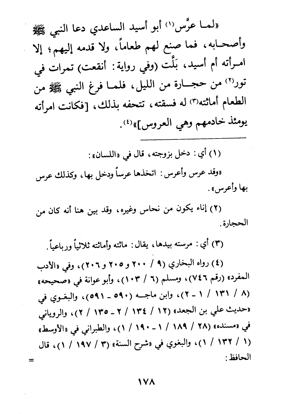 لما عرس1 أبو أسيد الساعدي دعا النبي صلى الله عليه وسلم وأصحابه فما صنع لهم طعاما ولا قدمه إليهم إلا امرأته أم أسيد بلت وفي رواية: أنقعت تمرات في تور2 من حجارة من الليل فلما فرغ النبي صلى الله عليه وسلم من الطعام أماثته3 له فسقته تتحفه بذلك [فكانت امرأته يومئذ خادمهم وهي العروس] 4.