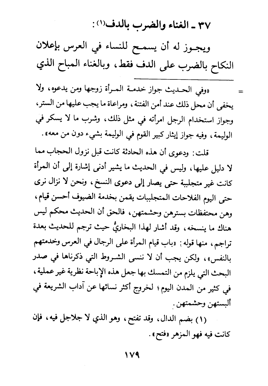 ويجوز له أن يسمح للنساء في العرس بإعلان النكاح بالضرب على الدف فقط وبالغناء المباح الذي