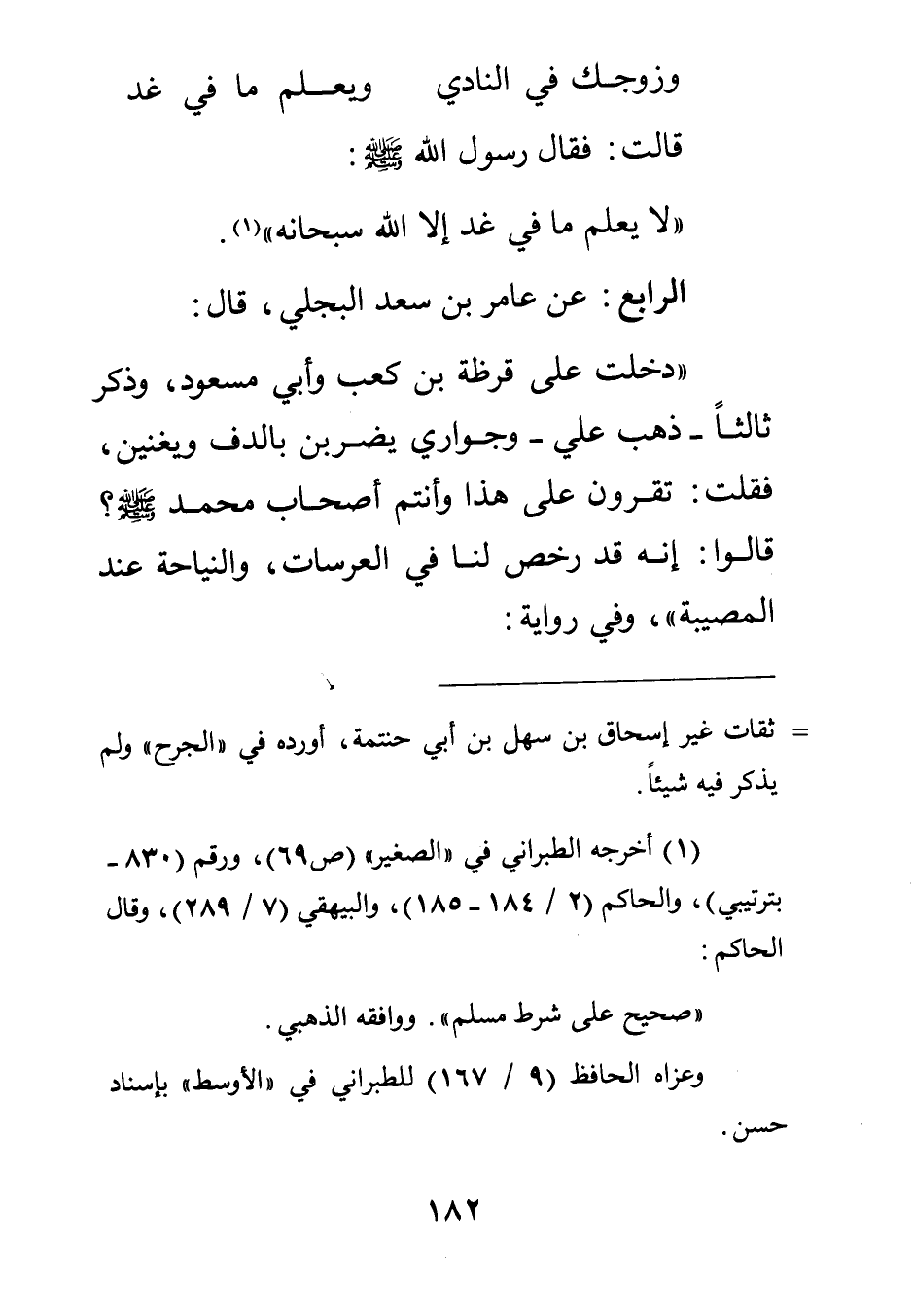 دخلت على قرظة بن كعب وأبي مسعود وذكر ثالثا - ذهب علي - وجواري يضربن بالدف ويغنين فقلت: تقرون على هذا وأنتم أصحاب محمد صلى الله عليه وسلم؟ قالوا: إنه قد رخص لنا في العرسات والنياحة عند المصيبة وفي رواية: