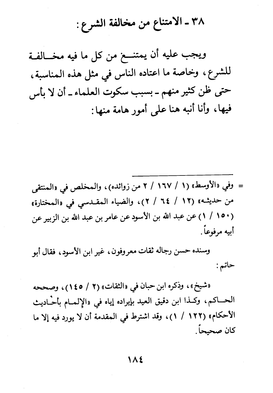 ويجب عليه أن يمتنع من كل ما فيه مخالفة للشرع وخاصة ما اعتاده الناس في مثل هذه المناسبة حتى ظن كثير منهم - بسبب سكوت العلماء - أن لا بأس فيها وأنا أنبه هنا على أمور هامة منها: