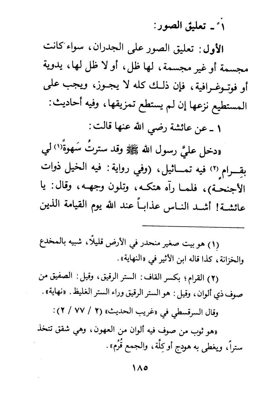 دخل علي رسول الله صلى الله عليه وسلم وقد سترت سهوة1 لي بقرام2 فيه تماثيل وفي رواية: فيه الخيل ذوات الأجنحة فلما رآه هتكه وتلون وجهه وقال: "يا عائشة! أشد الناس عذابا عند الله يوم القيامة الذين
