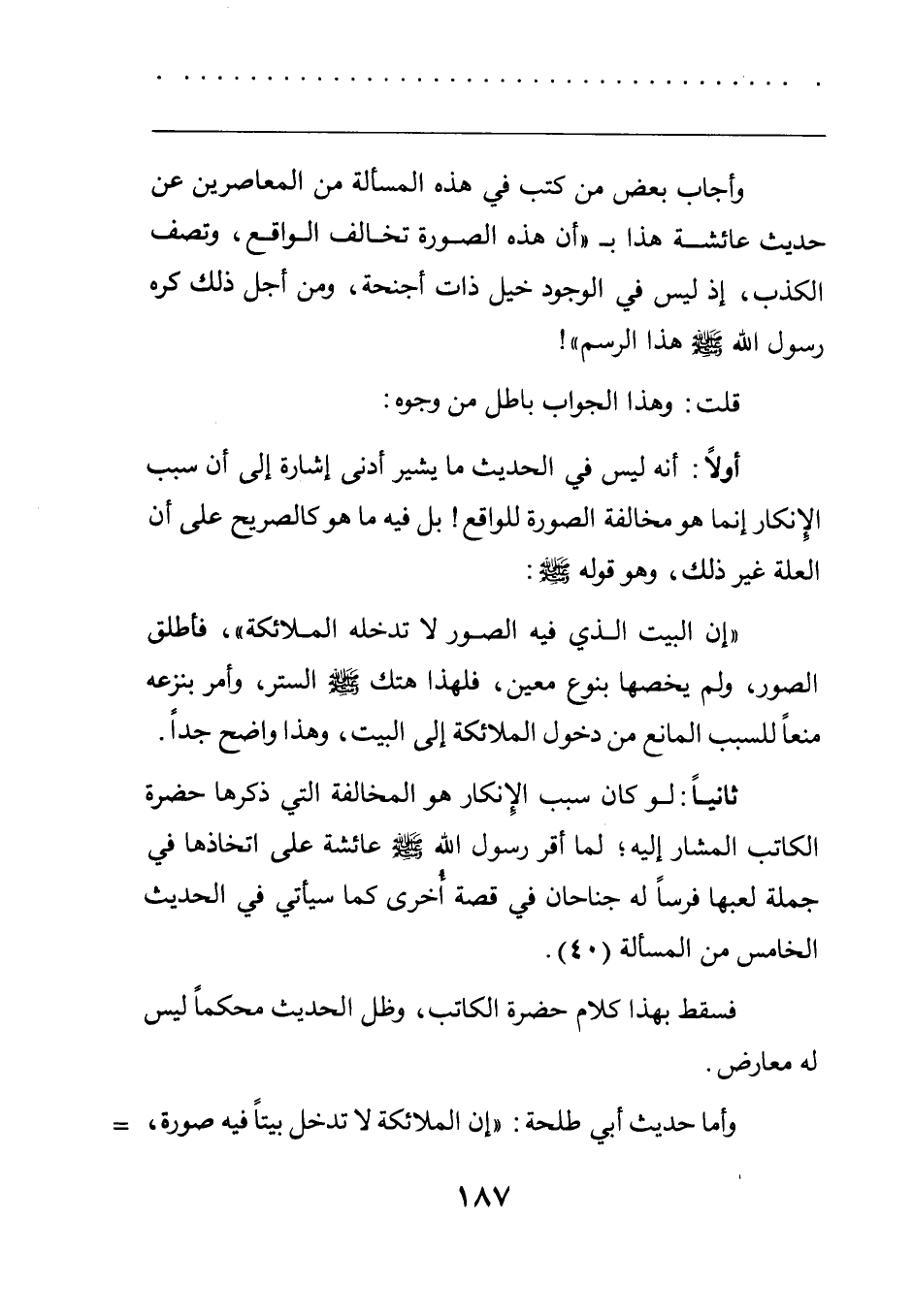 ثانيا: لو كان سبب الإنكار هو المخالفة التي ذكرها حضرة الكاتب المشار إليه لما أقر رسول الله صلى الله عليه وسلم عائشة على اتخاذها في جملة لعبها فرسا له جناحان في قصة أخرى كما سيأتي في الحديث الخامس من المسألة 40.