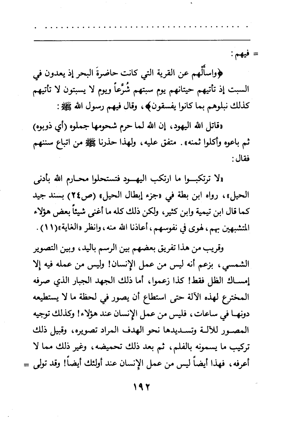 "لا ترتكبوا ما ارتكب اليهود فتستحلوا محارم الله بأدنى الحيل" رواه ابن بطة في جزء إبطال الحيل ص 24 بسند جيد كما قال ابن تيمية وابن كثير ولكن ذلك كله ما أغنى شيئا بعض هؤلاء المتشبهين بهم لهوى في نفوسهم أعاذنا الله منه وانظر العاية 11.