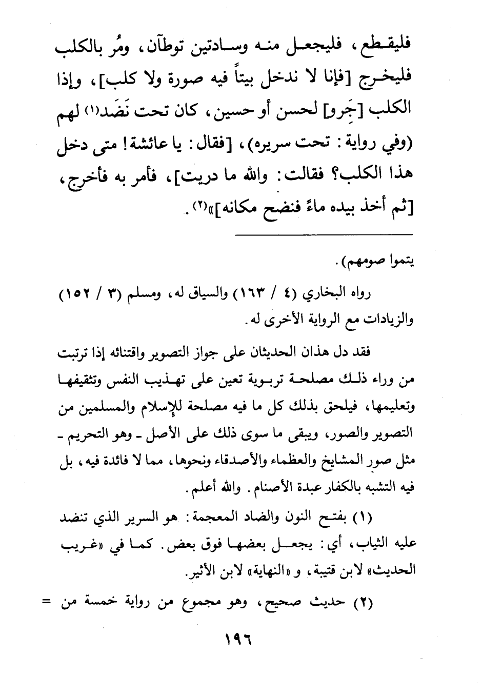 فليقطع فليجعل منه وسادتين توطآن ومر بالكلب فليخرج [فإنا لا ندخل بيتا فيه صورة ولا كلب] وإذا الكلب [جرو] لحسن أو حسين كانت تحت نضد1 لهم وفي رواية: تحت سريره [فقال: "يا عائشة! متى دخل هذا الكلب؟ " فقالت: والله ما دريت] فأمر به فأخرج [ثم أخذ بيده ماء فنضح مكانه] 2.