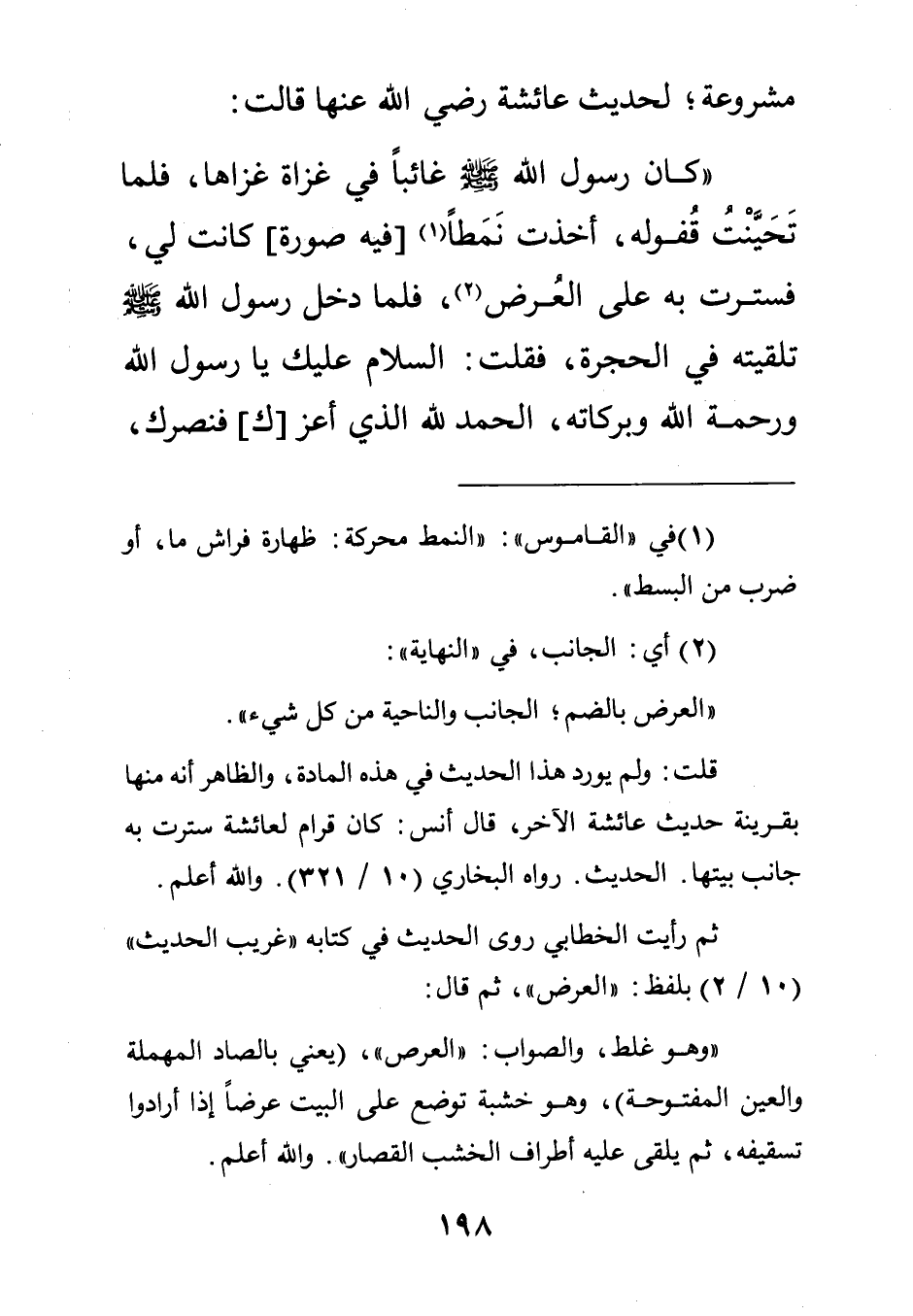 كان رسول الله صلى الله عليه وسلم غائبا في غزاة غزاها فلما تحينت قفوله أخذت نمطا1 [فيه صورة] كانت لي فسترت به على العرض2 فلما دخل رسول الله صلى الله عليه وسلم تلقيته في الحجرة فقلت: السلام عليك يا رسول ورحمة الله وبركاته الحمد لله الذي أعز [ك] فنصرك