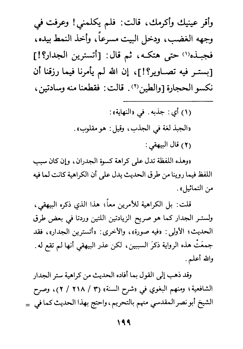 "وهذه اللفظة تدل على كراهة كسوة الجدران وإنكان سبب اللفظ فيما روينا من طرق الحديث يدل على أن الكراهية كانت لما فيه من التماثيل".