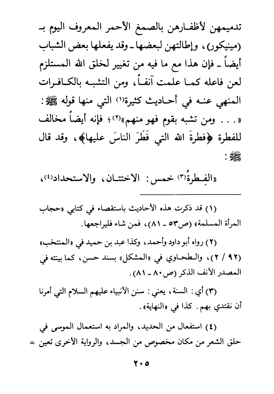 تدميمهن لأظفارهن بالصمغ الأحمر المعروف اليوم بـ مينيكور وإطالتهن لبعضها - وقد يفعلها بعض الشباب أيضا - فإن هذا مع ما فيه من تغير لخلق الله المستلزم لعن فاعله كما علمت آنفا ومن التشبه بالكافرات المنهي عنه في أحاديث كثيرة1 التي منها قوله صلى الله عليه وسلم: " ... ومن تشبه بقوم فهو منهم" 2 فإنه أيضا مخالف للفطرة {فِطْرَتَ اللَّهِ الَّتِي فَطَرَ النَّاسَ عَلَيْهَا} وقد قال صلى الله عليه وسلم: