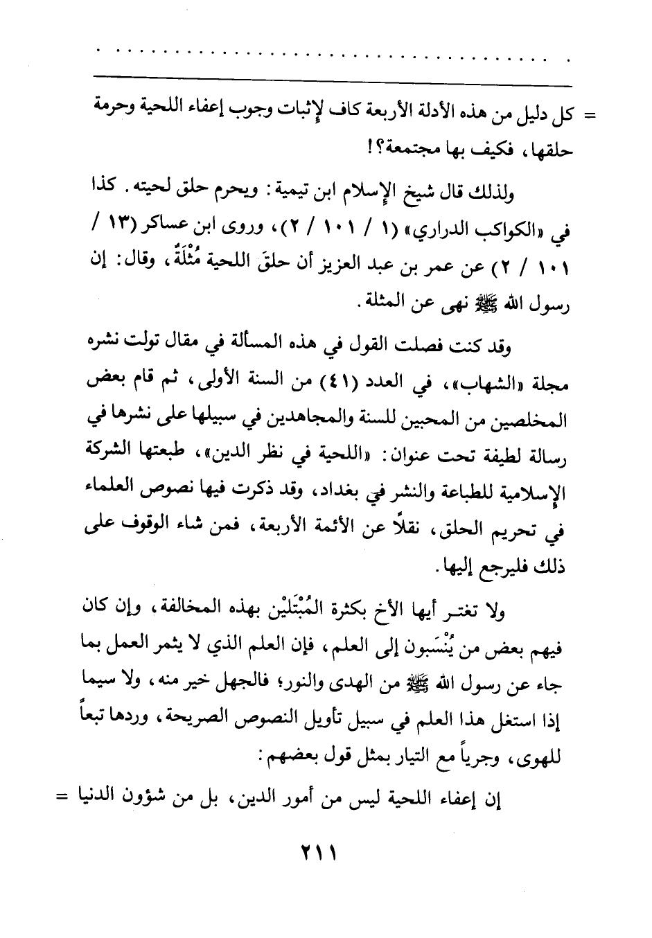كل دليل من هذه الأدلة الأربعة كاف لإثبات وجوب إعفاء اللحية وحرمة حلقها فكيف بها مجتمعة؟!