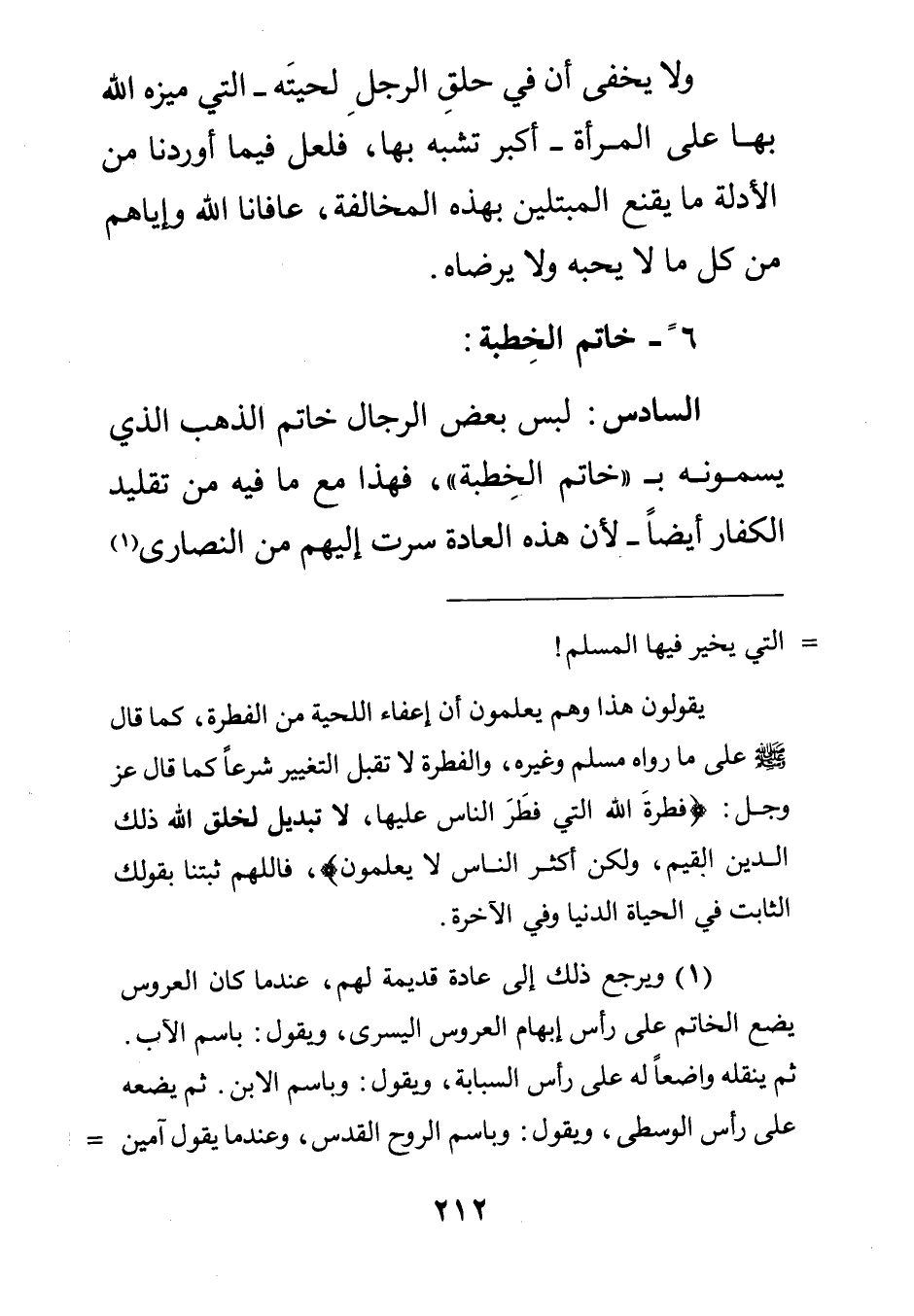 السادس: لبس بعض الرجال خاتم الذهب الذي يسمونه بـ "خاتم الخطبة" فهذا مع ما فيه من تقليد الكفار أيضا - لأن هذه العادة سرت إليهم من النصارى1