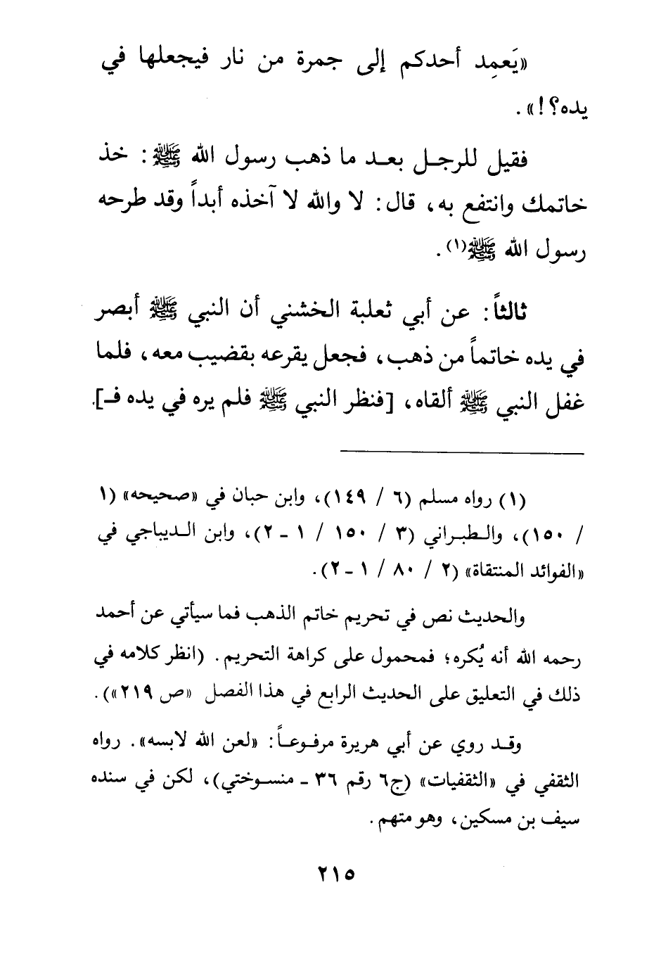 ثالثا: عن أبي ثعلبة الخشني أن النبي صلى الله عليه وسلم أبصر في يده خاتما من ذهب فجعل يقرعه بقضيب معه فلما غفل النبي صلى الله عليه وسلم ألقاه [فنظر النبي صلى الله عليه وسلم فلم يره في يده فـ]