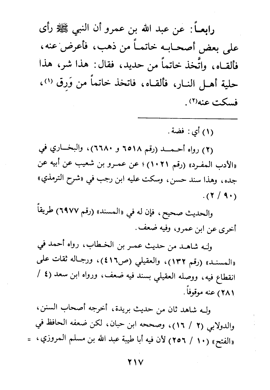 رابعا: عن عبد الله بن عمرو أن النبي صلى الله عليه وسلم رأى على بعض أصحابه خاتما من ذهب فأعرض عنه فألقاه واتخذ خاتما من حديد فقال: "هذا شر هذا حلية أهل النار" فألقاه فاتخذ خاتما من ورق1 فسكت عنه2.