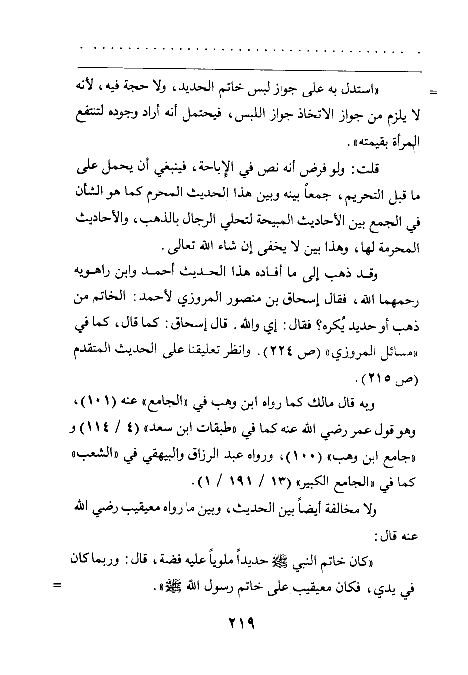 وقد ذهب إلى ما أفاده هذا الحديث أحمد وابن راهويه رحمهما الله فقال إسحاق بن منصور المروزي لأحمد: الخاتم من ذهب أو حديدي يكره؟ فقال: إي والله قال إسحاق كما قال كما في مسائل المروزي ص 224. وانظر تعليقنا على الحديث المتقدم ص 215.