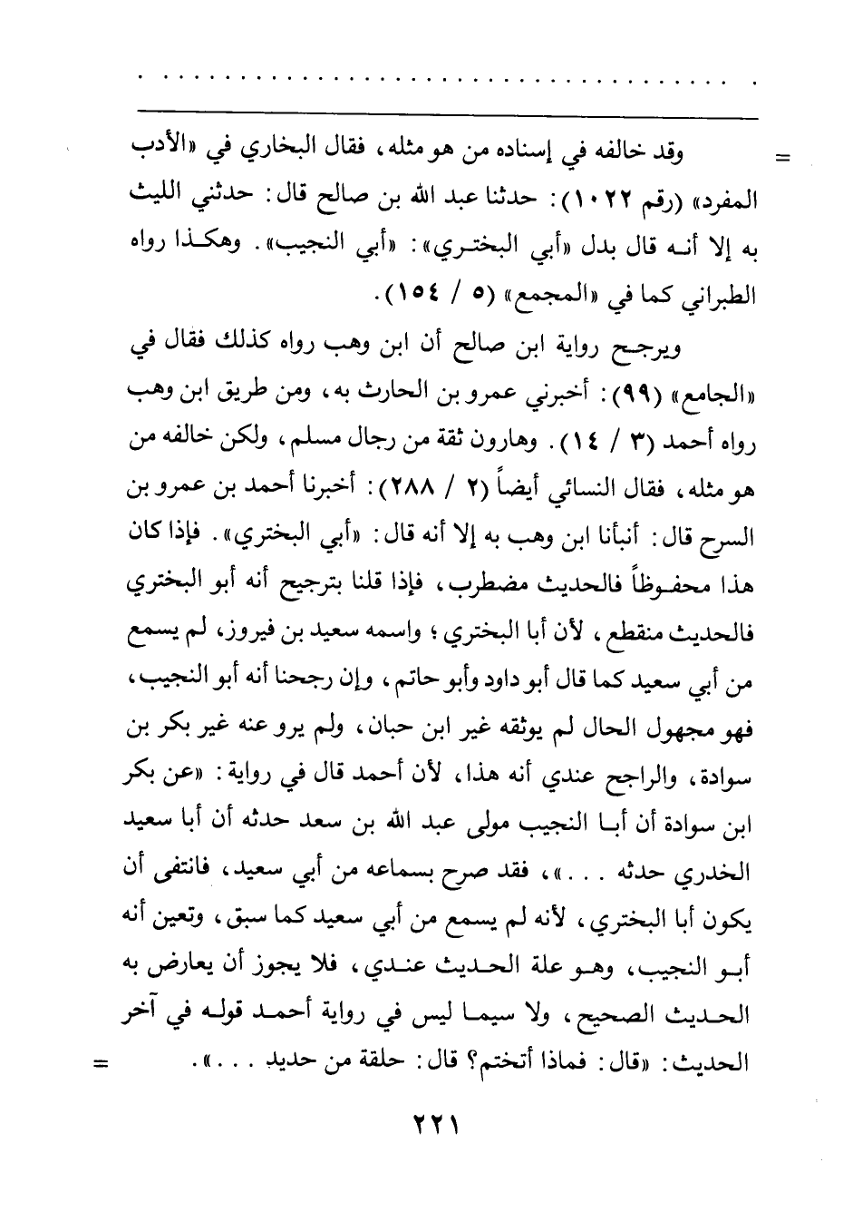 ويرجح في رةواية ابن صالح أن ابن وهب رواه كذلك فقال في الجامع 99: أخبرني عمرو بن الحارث به ومن طريق ابن وهب رواه أحمد 3/14. وهارون ثقة من رجال مسلم ولكن خالفه من هو مثله فقال النسائي أيضا 2/288: أخبرنا أحمد بن عمرو بن السرح قال: أنبأنا ابن وهب إلا أنه قال: أبي البختري. فإذا كان هذا محفوظا فالحديث مضطرب فإذا قلنا بترجيح أبي البختري فالحديث منقطع لأن أبا البختري واسمه سعيد بنفيروز لم يسمع من أبي سعيد كما قال أبو داود وأبو حاتم وإن رجحنا أنه أبو النجيب فهو مجهول الحال لم يوثقه غير ابن حبان ولم يرو عنه غير بكر بن سوادة والراجح عندي أنه هذا لأن أحمد دفي رواية: "عن بكر بن سوادة أن أبا النجيب مولى عبد الله بن سعد حدثه أن أبا سعيد الخدري حدثه ... " فقد صرح بسماعه من أبي سعيد كما سبق وتعين أنه أبو النجيب وهو علة الحديث عندي فلا يجوز أن يعارض به الحديث الصحيح ولا سيما ليس في رواية أحمد قوله في آخر الحديث: "قال: فماذا أتختم؟ قال: حلقة من حديد ... "