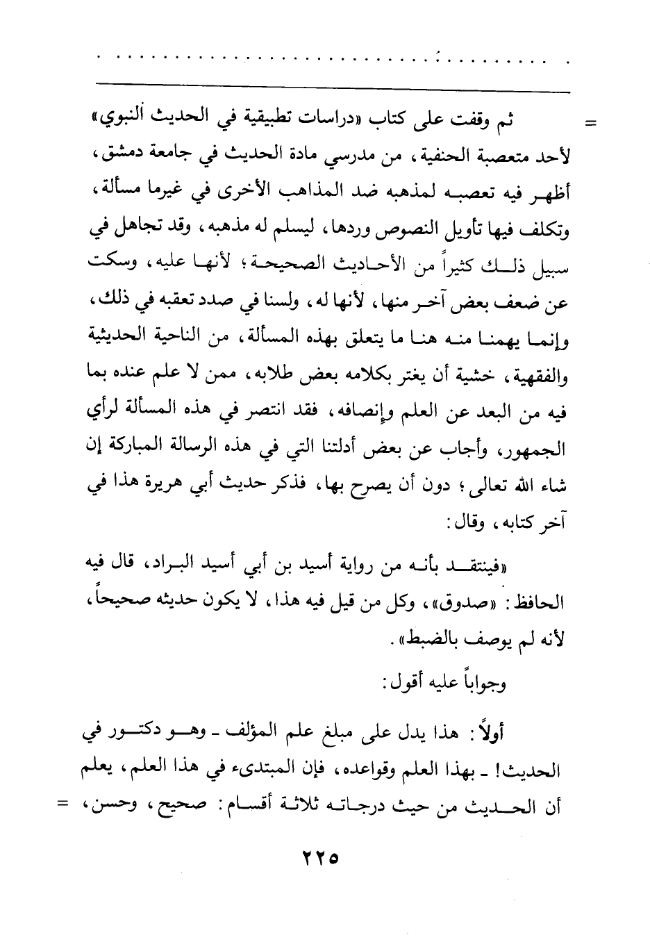 ثم وقفت على كتاب دراسات تطبيقة في الحديث النبوي لأحد متعصبة الحنفية من مدرسي مادة الحديث في جامعة دمشق أظهر فيه تعصبه لمذهبه ضد المذاهب الأخرى في غير ما مسألة وتكلف فيها تأويل النصوص وردها ليسلم له مذهبه وقد تجاهل في سبيل ذلك كثيرا من الأحاديث الصحيحة لأنها عليه وسكت عن ضعف بعض آخر منها لأنها له ولسنا في صدد تعقبه في ذلك وإنما يهمنا منه هنا ما يتعلق بالمسألة من الناحية الحديثية والفقهية خشية أن يغتر بكلامه بعض طلابه ممن لا علم عنده بما فيه من البعد عن العلم وإنصافه فقد انتصر في هذه المسألة لرأي الجمهور وأجاب عن بعض أدلتنا التي في هذه الرسالة المباركة إن شاء الله تعالى دون أن يصرح بها فذكر حديث أبي هريرة هذا في آخر كتابه وقال: