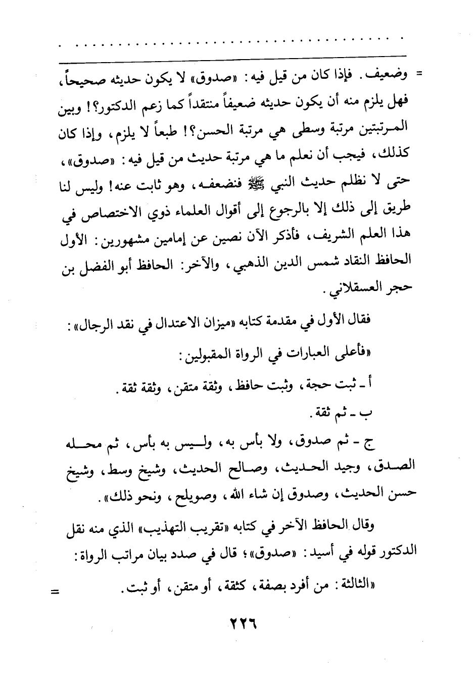 وضعيف. فإذا كان من قيل فيه صدوق لا يكون حديثه صحيحا فهل يلزم منه أن يكون حديثه ضعيفا منتقدا كما زعم الدكتور؟! وبين المرتبتين مرتبة وسطى هي مرتبة الحسن؟! طبعا لا يلزم وإذا كان كذلك فيجب أن نعلم ماهي مرتبة حديث من قيل فيه: "صدوق" حتى لا نظلم حديث النبي صلى الله عليه وسلم فنضعفه وهو ثابت عنه! وليس لنا طريق إلى ذلك إلا بالرجوع إلى أقوال العلماء ذوي الاختصاص في هذا العلم الشريف فأذكر الآن نصين عن إمامين مشهورين: الأول الحافظ النقاد شمس الدين الذهبي والآخر: الحافظ أبو الفضل بن حجر العسقلاني.