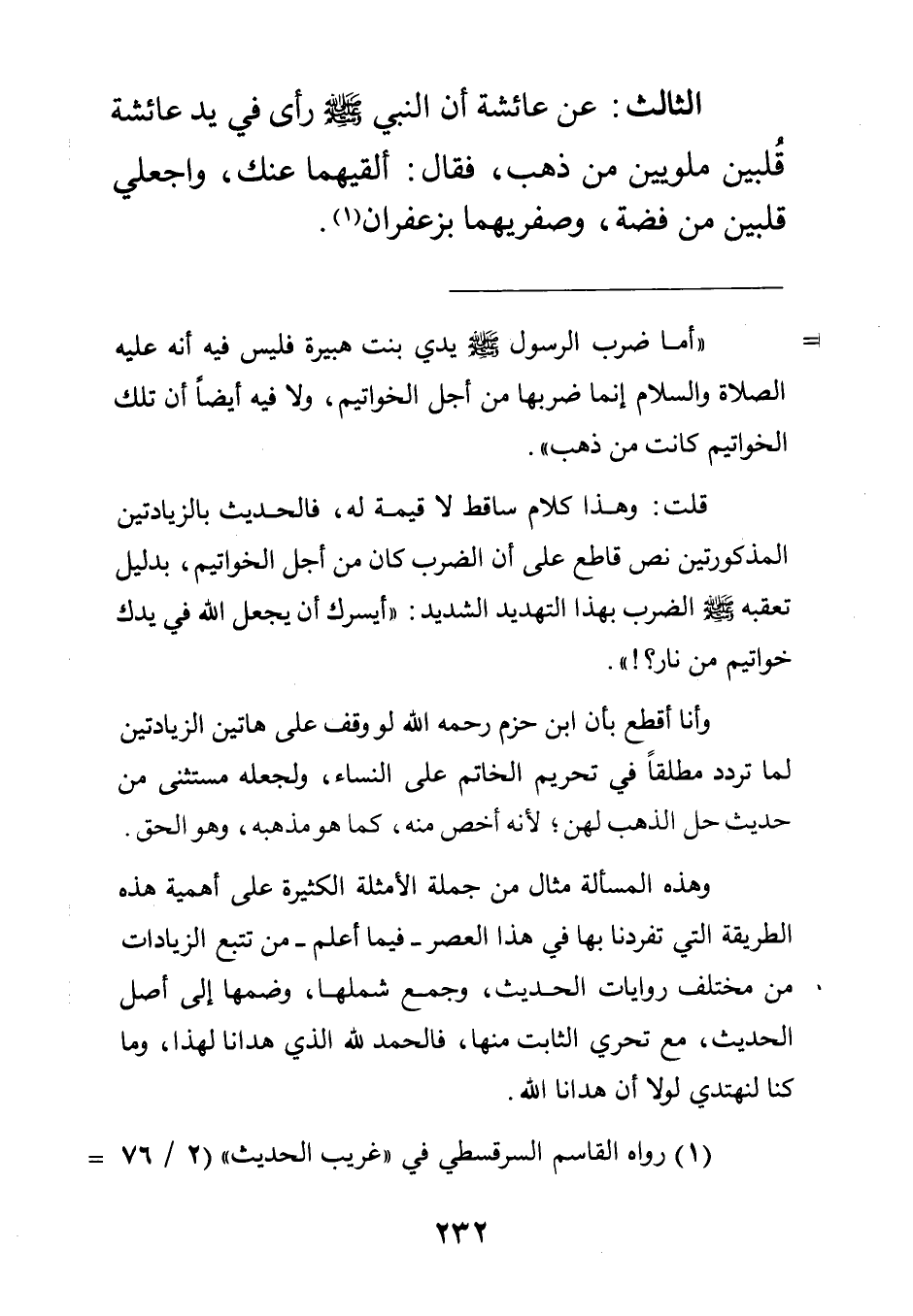 "أما ضرب الرسول صلى الله عليه وسلم يدي بنت هبيرة فليس فيه أنه عليه الصلاة والسلام إنما ضربها من أجل الخواتيم ولا فيه أيضا أن تلك الخواتيم كانت من ذهب".