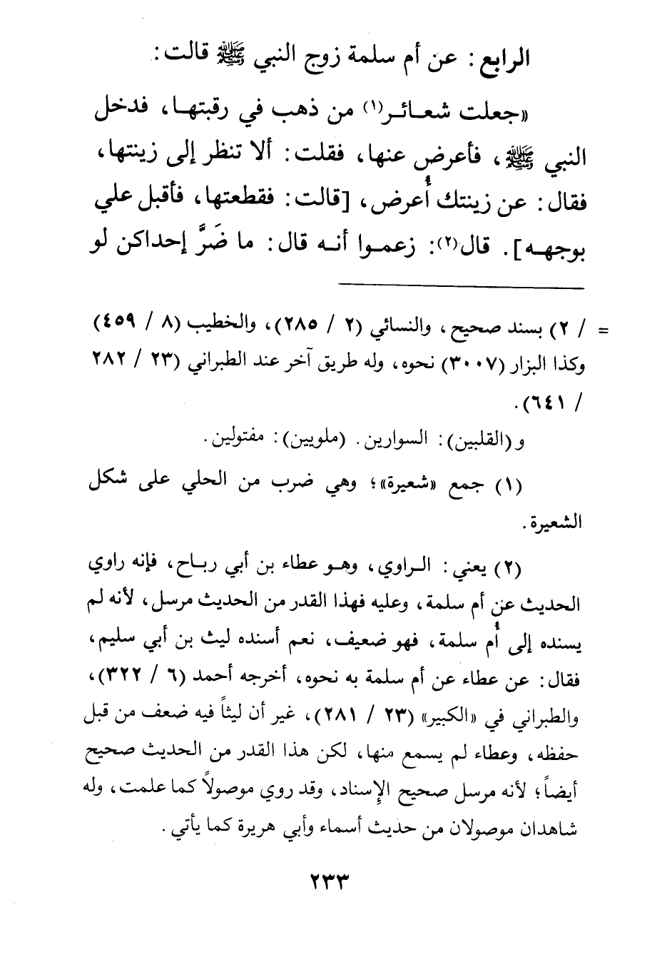 2 يعني: الراوي وهو عطاء بن أبي رباح فإنه راوي الحديث عن أم سلمة وعليه فهذا القدر من الحديث مرسل لأنه لم يسنده إلى أم سلمة فهو ضعيف نعم أسنده ليث بن أبي سليم فقال: عن عطاء عن أم سلمة به نحه أخرجه أحمد 6/322 والطبراني في "الكبير" 23/281 غير أن ليثا فيه ضعف من قبل حفظه وعطاء لم يسمع منها لكن هذا القدر من الحديث صحيح أيضا لأنه مرسل صحيح الإسناد وقد روي موصولا كما علمت وله شاهدان موصولان من حديث أسماء وأبي هريرة كما يأتي