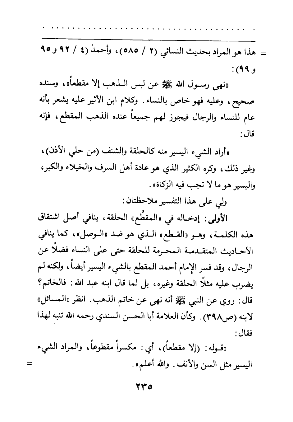الأولى: إدخاله في المقطع الحلقة ينافي أصل اشتقاق هذه الكلمة وهو القطع الذي هو ضد الوصل كما ينافي الأحاديث المتقدمة المحرمة للحلقة حتى على النساء فضلا عن الرجال وقد فسر الإمام أحمد المقطع بالشيء اليسير أيضا ولكنه لم يضرب عليه مثلا الحلقة وغيره بل لما قال ابنه عبد الله: فالخاتم؟ قال روي عن النبي صلى الله عليه وسلم أنه نهى عن خاتم الذهب. انظر المسائل لابنه ص 398 وكأن العلامة أبا الحسن السندي رحمه الله تنبه لهذا فقال: