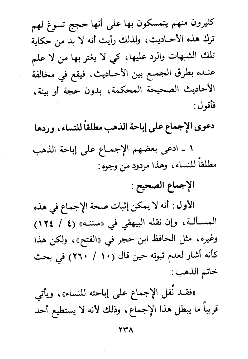 الأول: أنه لا يمكن إثبات صحة الإجماع في هذه المسألة وإن نقله البيهقي في "سننه" 4 / 124 وغيره مثل الحافظ ابن حجر في "الفتح" ولكن هذا كأنه أشار لعدم ثبوته حين قال: 10 / 260 في بحث خاتم الذهب: