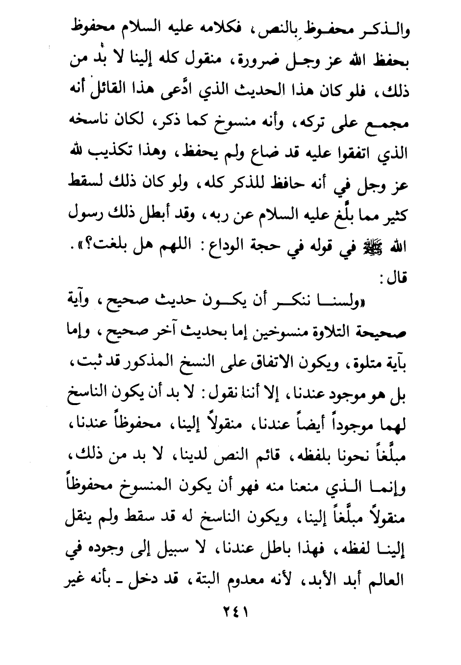 "ولسنا ننكر أن يكون حديث صحيح وآية صحيحة التلاوة منسوخين إما بحديث آخر صحيح وإما بآية متلوة ويكون الاتفاق على النسخ المذكور قد ثبت بل هو موجود عندنا إلا أننا نقول: لا بد أن يكون الناسخ لهما موجودا أيضا عندنا منقولا إلينا محفوظا عندنا مبلغا نحونا بلفظه قائم النص لدينا لا بد من ذلك وإنما الذي منعنا منه فهو أن يكون المنسوخ محفوظا منقولا مبلغا إلينا ويكون الناسخ له قد سقط ولم ينقل إلينا لفظه فهذا باطل عندنا لا سبيل إلى وجوده في العالم أبد الأبد لأنه معدوم البتة قد دخل - بأنه غير