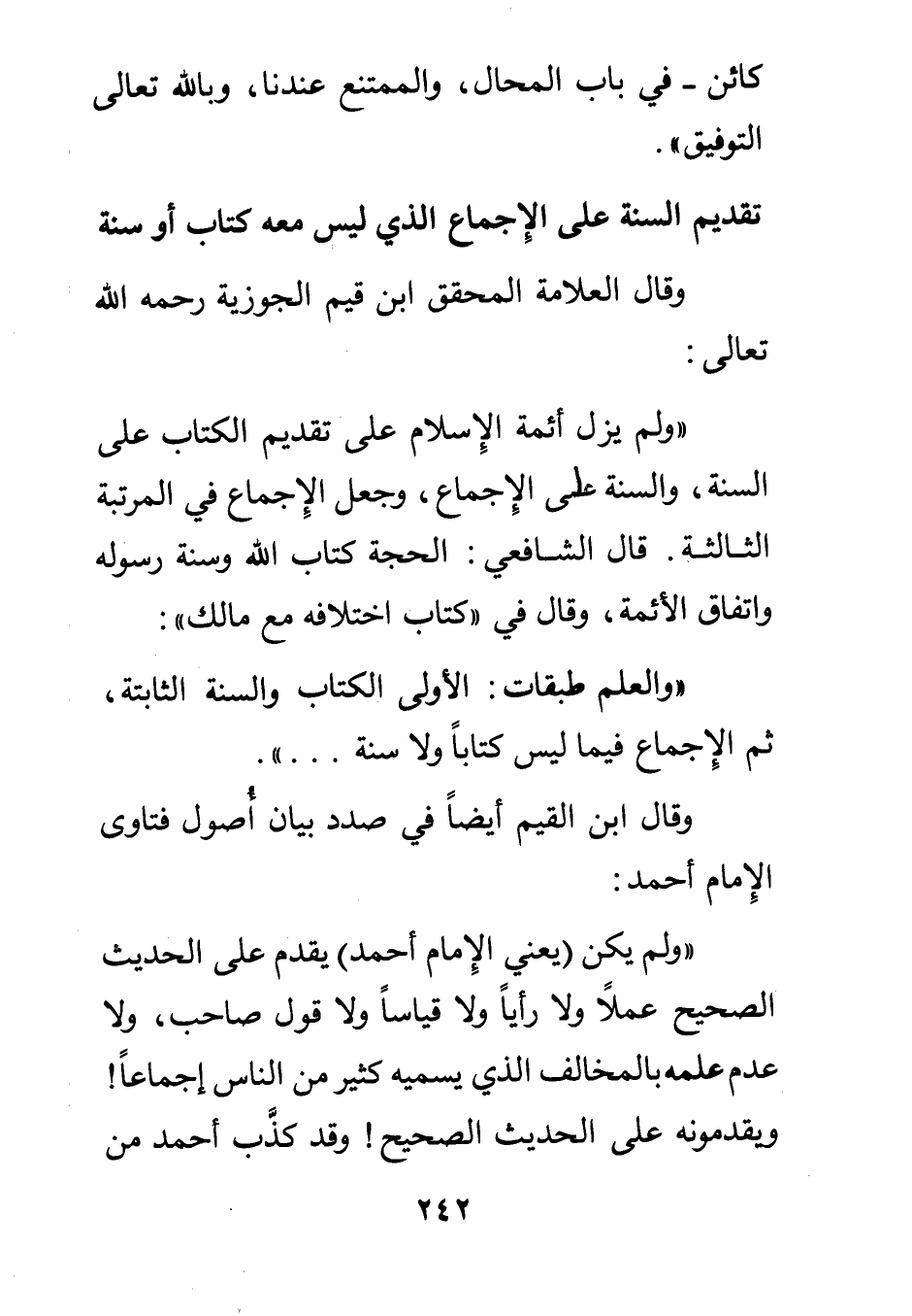 "ولم يكن يعني الإمام أحمد يقدم على الحديث الصحيح عملا ولا رأيا ولا قياسا ولا قول صاحب ولا عدم علمه بالمخالف الذي يسميه كثير من الناس إجماعا ويقدمونه على الحديث الصحيح! وقد كذب أحمد من