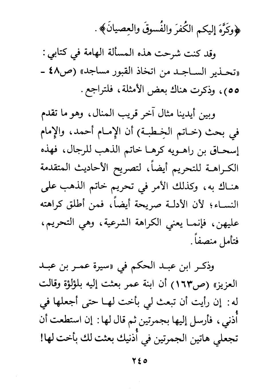 وبين أيدينا مثال آخر قريب المنال وهو ما تقدم في بحث خاتم الخطبة أن الإمام أحمد والإمام إسحاق بن راهويه كرها خاتم الذهب للرجال فهذه الكراهة للتحريم أيضا لتصريح الأحاديث المتقدمة هناك به وكذلك الأمر في تحريم خاتم الذهب على النساء لأن الأدلة صريحة أيضا فمن أطلق كراهته عليهن فإنما يعني الكراهة الشرعية وهي التحريم فتأمل منصفا.