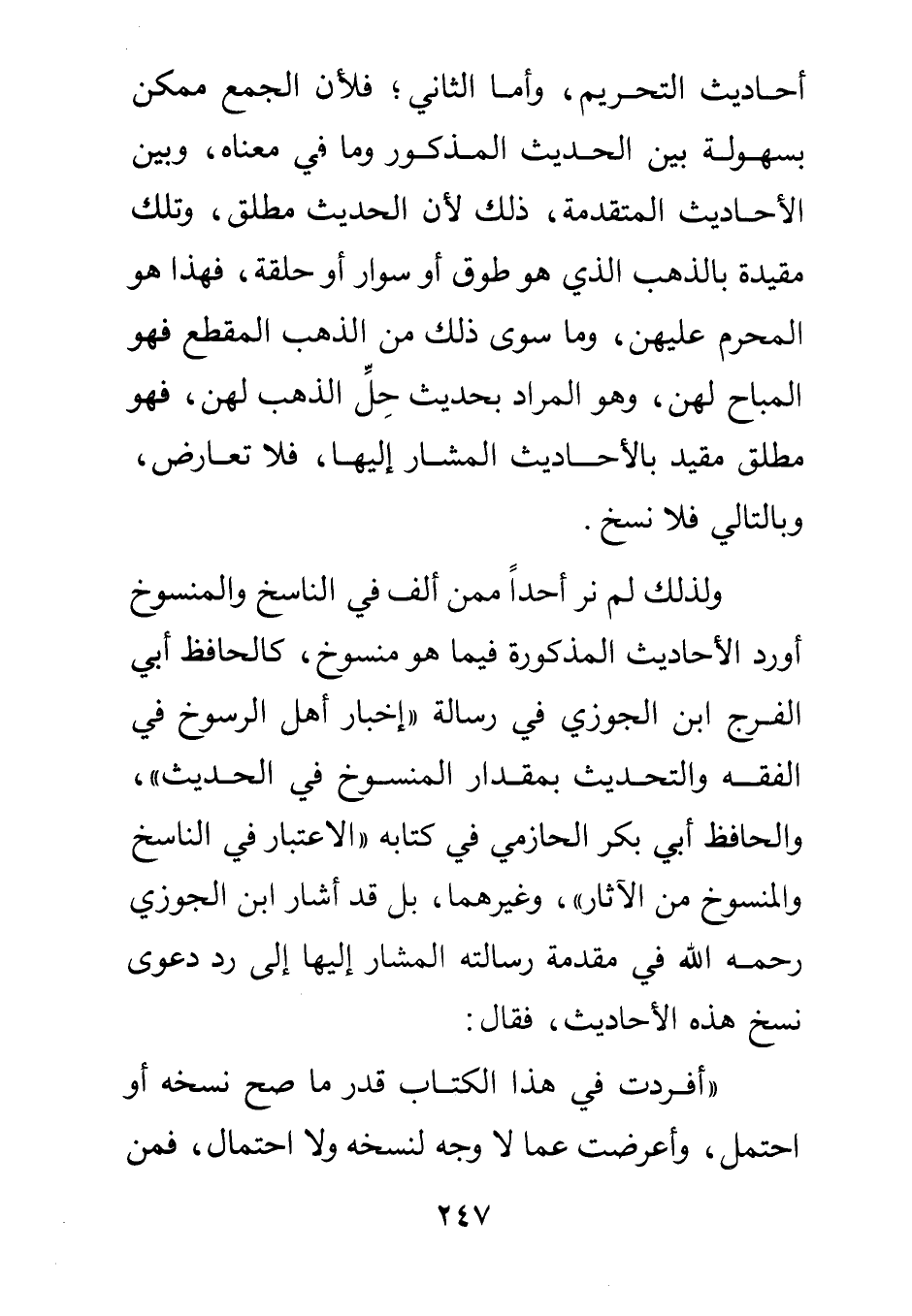 ولذلك لم نر أحدا ممن ألف في الناسخ والمنسوخ أورد الأحاديث المذكورة فيما هو منسوخ كالحافظ أبي الفرج ابن الجوزي في رسالة إخبار أهل الرسوخ في الفقه والتحديث بمقدار المنسوخ في الحديث والحافظ أبي بكر الحازمي في كتابه الاعتبار في الناسخ والمنسوخ من الآثار وغيرهما بل قد أشار ابن الجوزي رحمه الله في مقدمة رسالته المشارة إليها إلى رد دعوى نسخ هذه الأحاديث فقال: